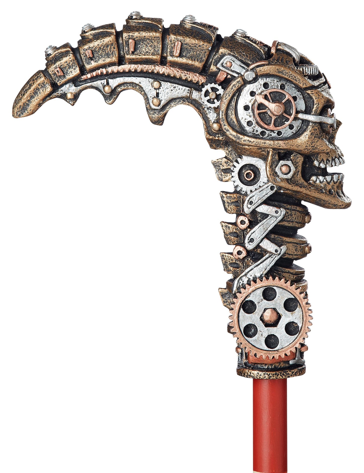 Ova Steampunk trska namijenjena je odraslima. Dostavlja se u 2 dijela, a kada se montira, mjeri približno 100 cm. Ona je brončana, s lubanjem s steampunk izgledom na vrhu (zupčanici, vijci ...). Ovaj će dodatak biti originalan kako bi dovršio vašu steampunk prerušanu tijekom prerušene stranke.