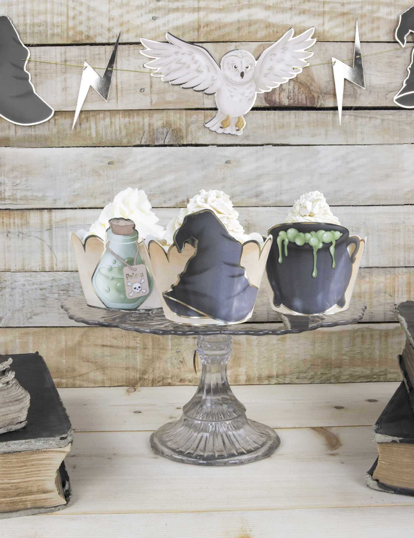 Ova serija sastoji se od 6 kalupa za kolače. Ukrašeni su kotlom, kapu s čarobnjakom i napitkom. Oni će biti savršeni za ukrašavanje vaših kolača na temu čarobnjaka!
