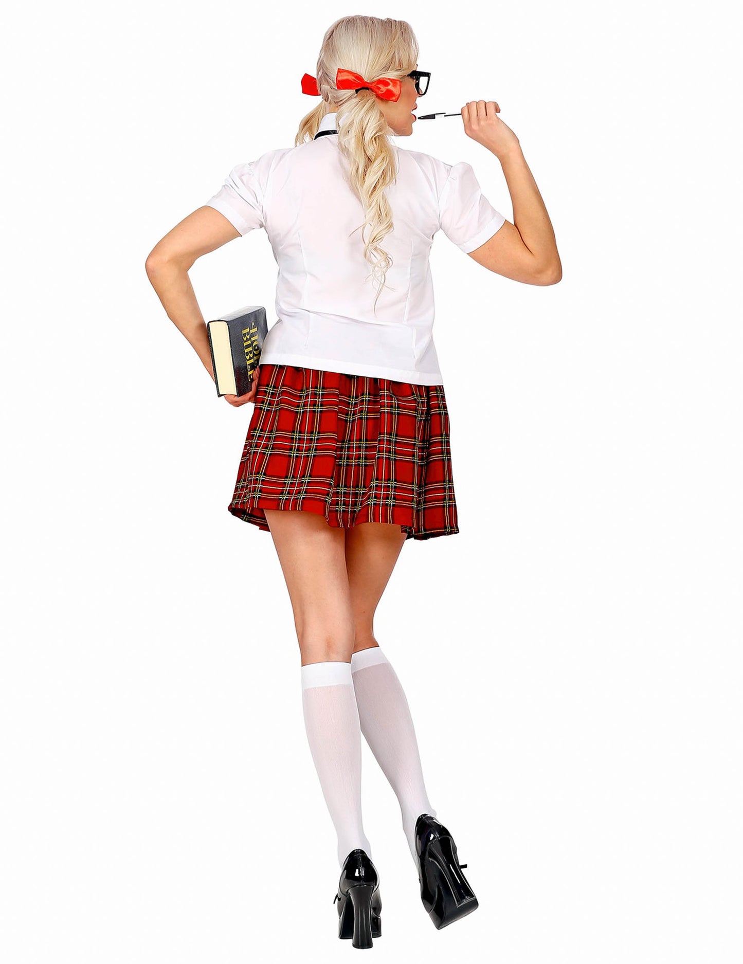Ova maskiranje za školsku kuću namijenjena je ženama i sastoji se od košulje, kravate, suknje i 2 čvora. Krava je kratka i bijela boje. Savijena je u veličini. Ima gumbe sprijeda kako bi ga lako zatvorili. Suknja je presavijena i crvena. Ukrašen je različitim pločicama koje podsjećaju na školsku odjeću. Crna kravata i luk za kosu donijet će konačni dodir u ovu odjeću. Ovaj kompletni kostim školarke bit će savršen za vaše tematske večeri!