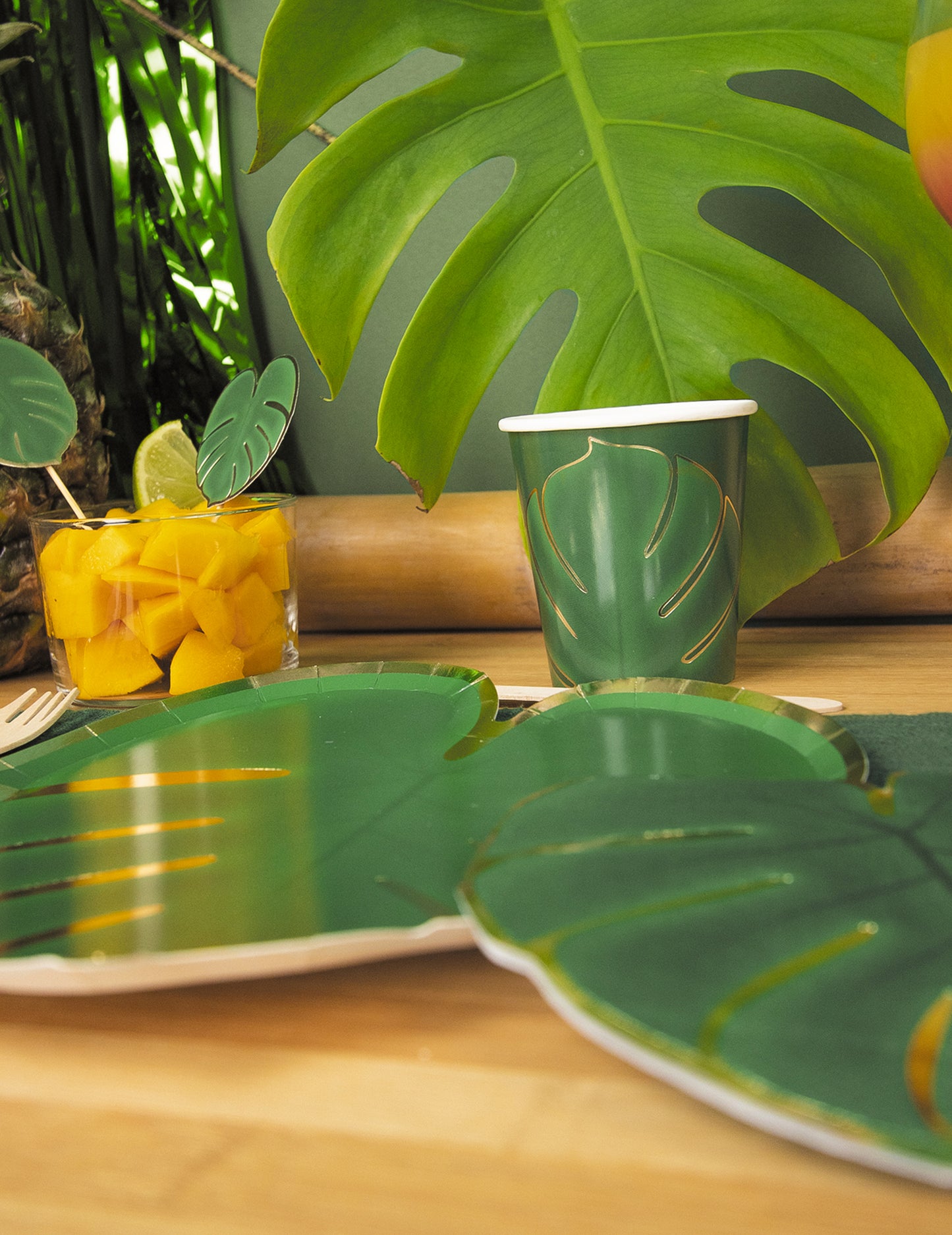 Ove se čašice prodaju u puno 8 i izrađene su od kartona, zelene boje, imaju veličanstveni tropski lim sa zlatnim obrisom. Ove šalice imaju kapacitet od oko 200 ml. Ova serija šalica donijet će konačni dodir vašem rođendanskom ukrasu na tropskoj temi!