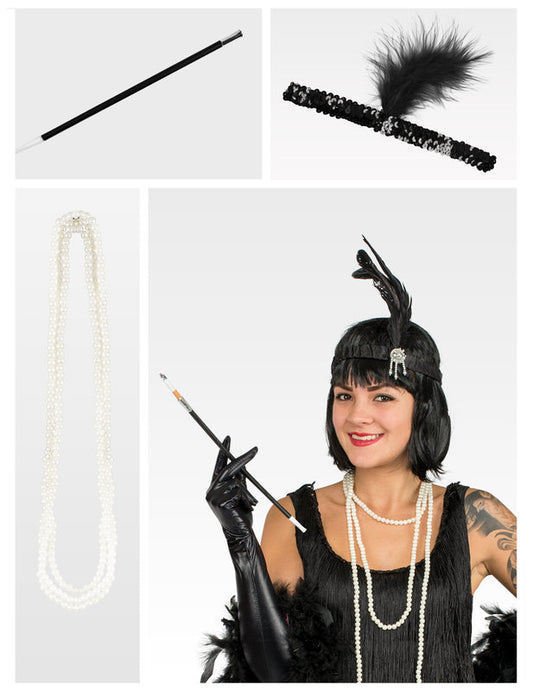 Uključeno: 2 naušnice, ogrlica, držač za cigarete, duge rukavice, traka za glavu