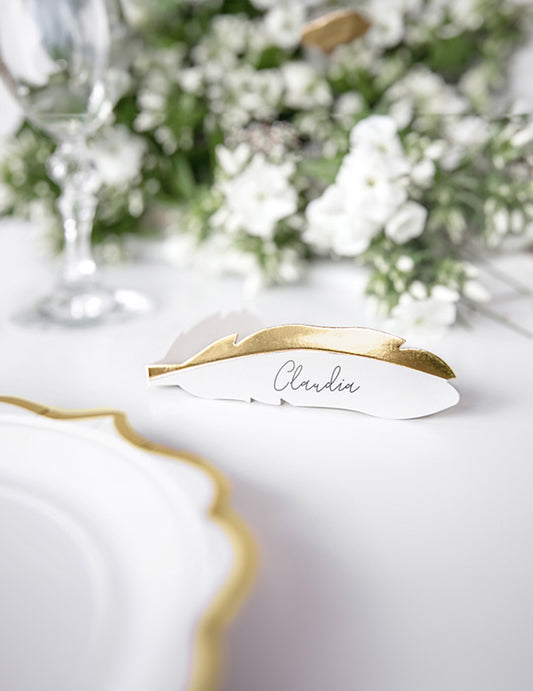 Rasprodano10 kartonskih kartica s mjestima s bijelim i metalik zlatnim perjem, 10,5 x 3 cm za vjenčanje
