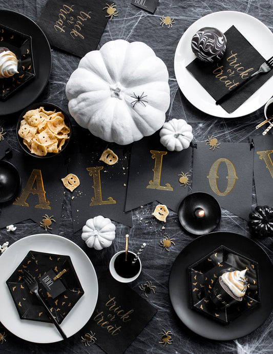 Rasprodano6 crno-zlatnih kartonskih tanjura u obliku šišmiša 20 cm šesterokutni