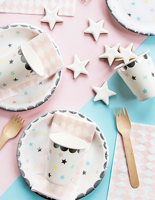 Rasprodano8 nazubljenih pastelno ružičastih kartonskih tanjura 23 cm dugine zvijezde