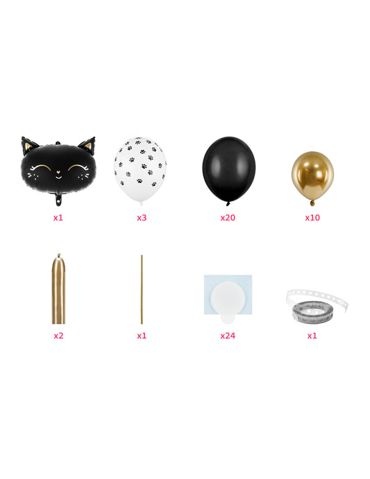 Uključeno: 33 balona, 1 balon crne mačke , 2 modelna balona , 1 slamka , 24 ljepila , 1 vrpca za girlandu od balona