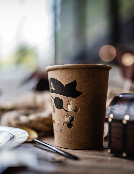 Rasprodano8 gusarskih čaša od kraft papira sa zlatnim obrubom, 255 ml, dizajn lubanje i prekriženih kostiju