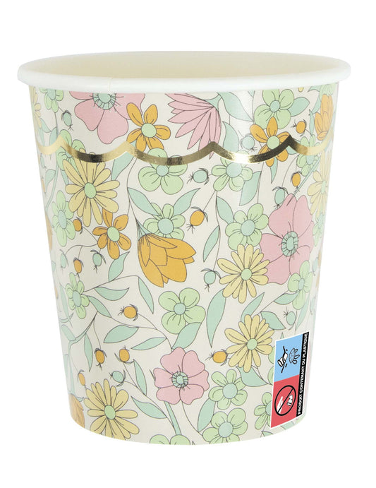 8 shabby chic kartonskih čaša s nazubljenim zlatnim uzorkom, 200 ml, s Liberty printom.