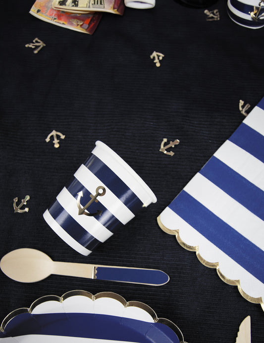 8 kartonskih čaša s nazubljenim uzorkom, 200 ml, s nautičkim prugama i zlatnim sidrom