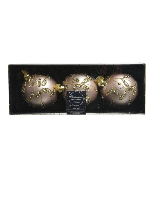 Promocija3 božićne kuglice od ružičastog matiranog stakla sa zlatnim listovima 8 cm