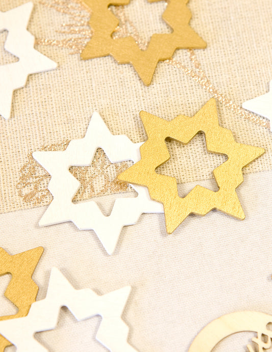 Promocija8 drvenih konfeta za stol u obliku bijelih i zlatnih zvijezda 5 x 4,4 cm