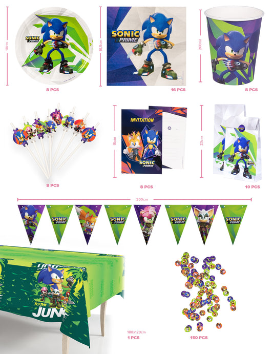 Uključeno: 8 tanjura, 16 salveta, 8 šalica, 1 stolnjak, Vijenac od zastava, 8 poklon vrećica, 150 konfeta, 8 slamki, 8 pozivnica
