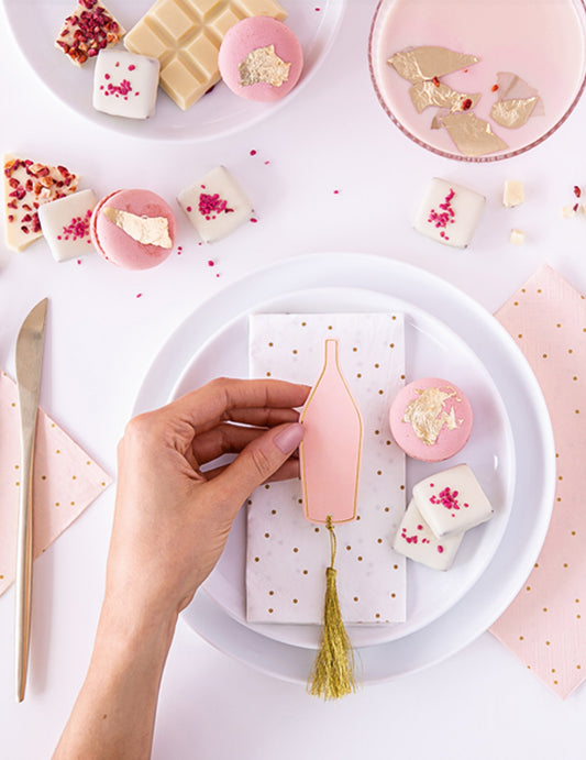 Rasprodano6 ružičasto-zlatnih kartonskih kartica s mjestima u obliku boce sa zlatnim resicama