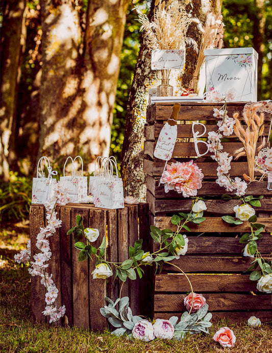 Uključeno: 1 natpis "Živjeli mladenci" od tila, 2 cvijeta od tila , 1 rola tila , 2 zatezna čvora