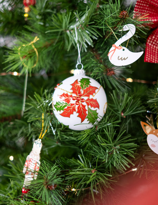 Rasprodano2 bijele staklene kuglice s božikovinom 8 cm za jelku