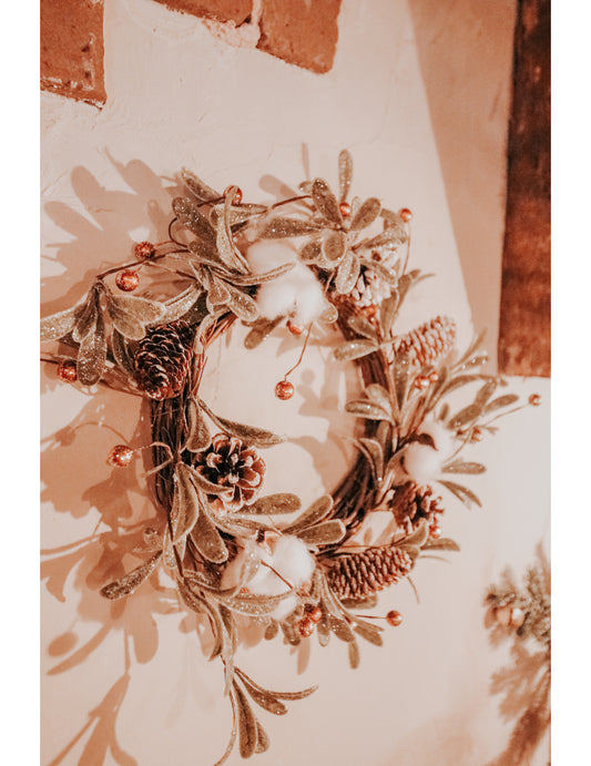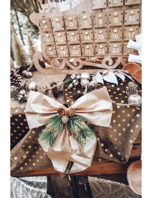 RasprodanoMašna sa šljokicama u boji šampanjca, bor i češeri 24 x 28 cm