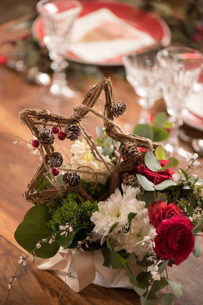 RasprodanoViseća svjetiljka u obliku zvijezde od prirodnog drva 20 x 32 cm s bobicama i borovim češerima