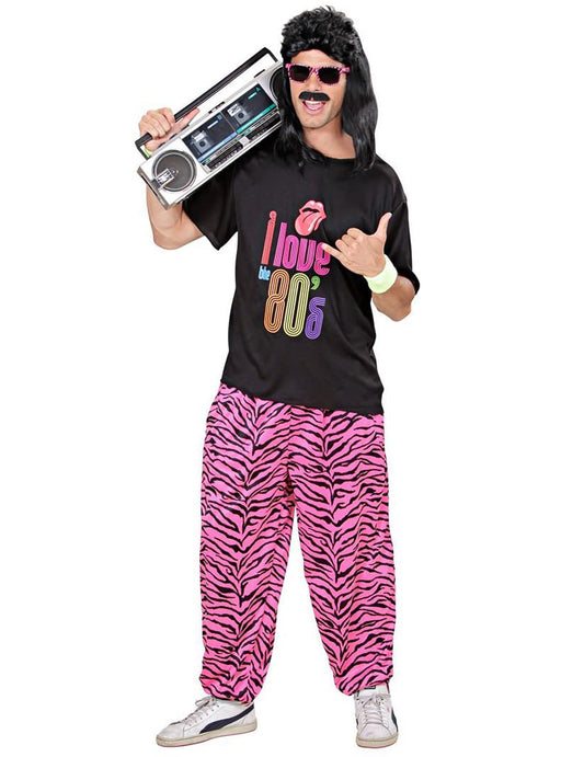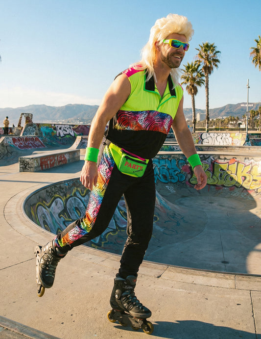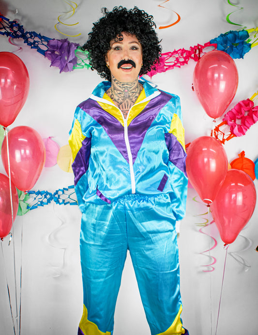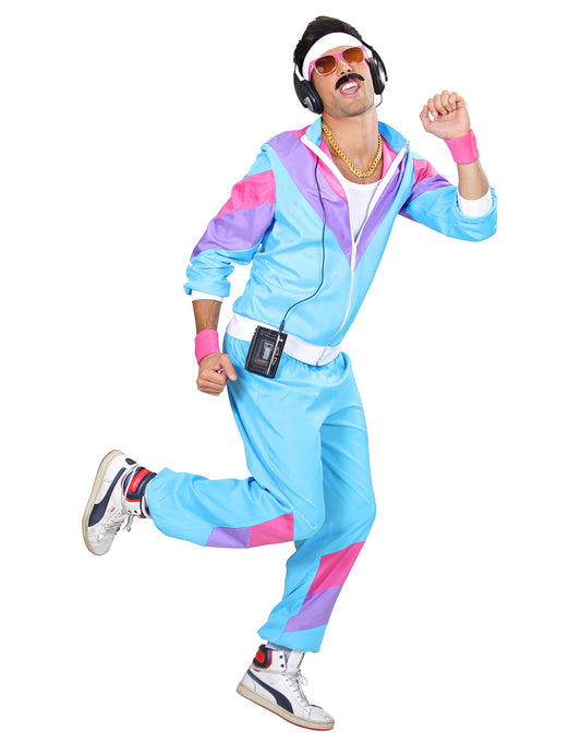 Za muškarce, šarena trenirka ključni je komad sportskog kostima iz 80-ih. Odlučite se za svijetle boje poput ružičaste, zelene ili plave. U to su vrijeme bili vrlo popularni modeli s printom poput pruga, geometrijskih uzoraka ili predimenzioniranih logotipa. Kako biste upotpunili svoj outfit, razmislite o paru retro tenisica. Siguran izbor su bijeli kožni modeli s intenzivnim bojama. Kako biste svom izgledu dodali dašak autentičnosti, ne zaboravite na legendarne modne dodatke tog doba, poput bejzbolske kape koja se nosi unatrag ili torbice. Konačno, za doista odvažan izgled možete se odlučiti za lažne brkove, vrlo moderne 80-ih.