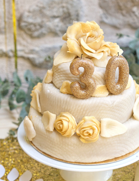 Zlatna svjećica u obliku broja 2 s glitterom 8,5 cm s držačem