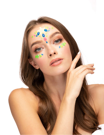 Uključeno: 1 šablona , 14 cirkona , 1 olovka za šminkanje , 1 paleta sjenila za oči , 1 vrećica gela s glitterima , 1 spužva