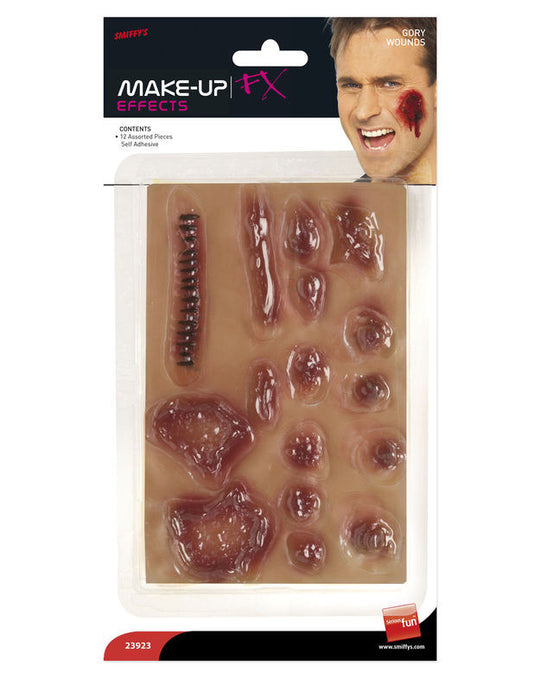Uključeno: 2 spužve od pjene, 1 kist, 1 patentni zatvarač, 1 vrećica umjetne krvi (7 ml), 1 vrećica tekućeg lateksa (7 ml), 1 vrećica zelenog tekućeg umjetnog mesa (7 ml), 2 crno-bijela sjenila za oči (1,5 g svako)