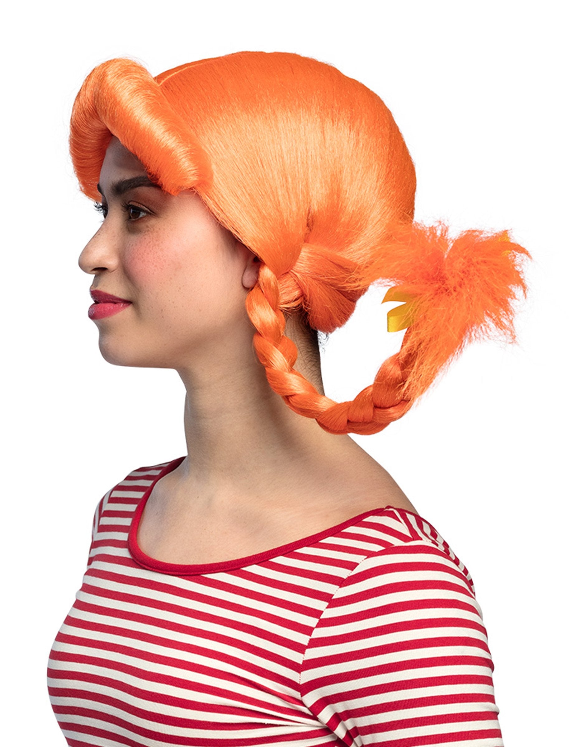 Ova ženska perika je narančasta. Pletenice se podižu na stranama i rub je dovršen. Elegantno će dovršiti vaše zlonamjerne kostime tijekom prerušenih ili tematskih večeri.