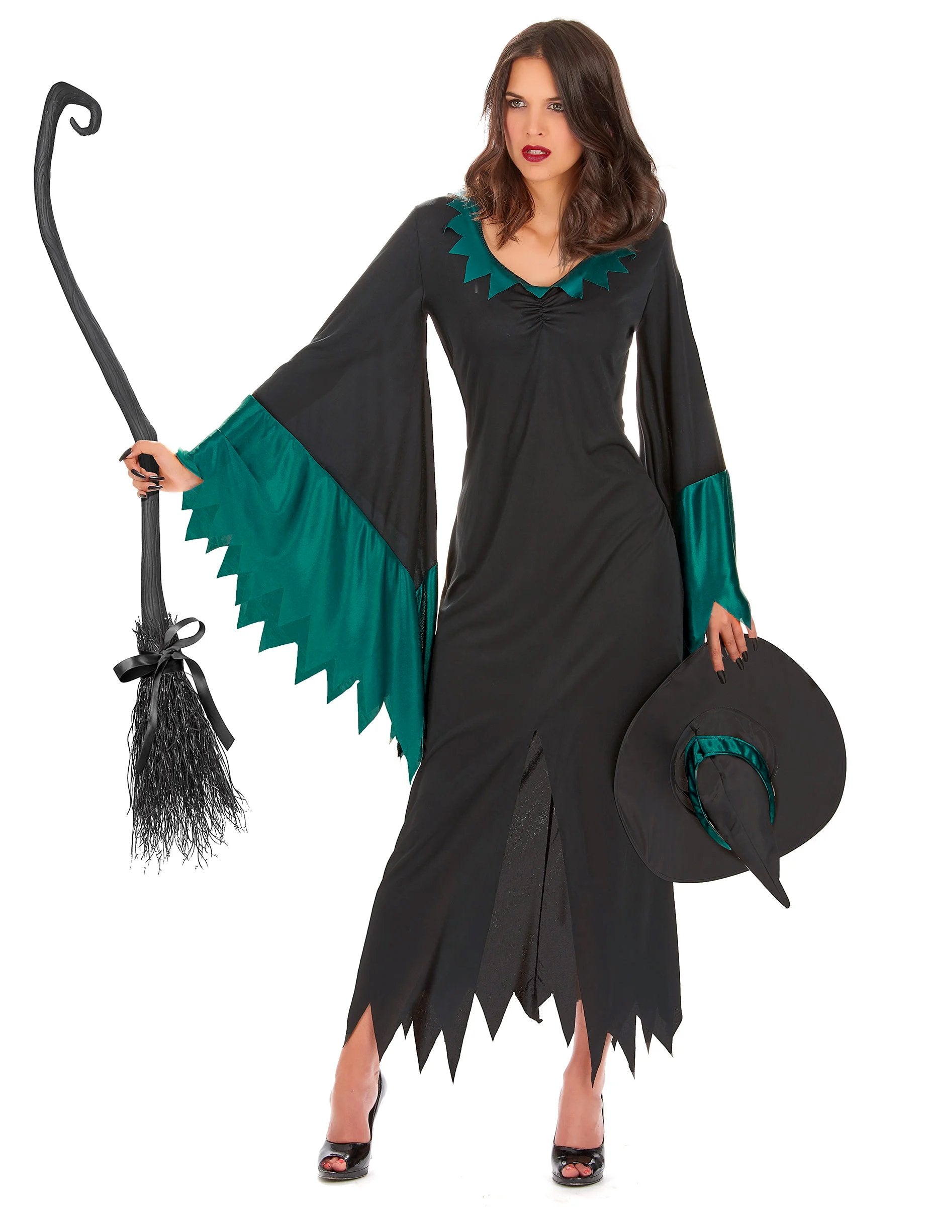 Ovaj čarobnjak za Noć vještica prerušen za žene uključuje haljinu i crni šešir. Haljina je obilna i podijeljena je iznad koljena. Rukavi su plamteni. Zarezi zelene boje uljepšavaju prerušavanje u rukave, ovratnik i pojas iste boje oko baze šešira. Ovaj je kostim savršen za vaše prikrivene večeri ili za Noć vještica. Biti zastrašujući nego ikad.