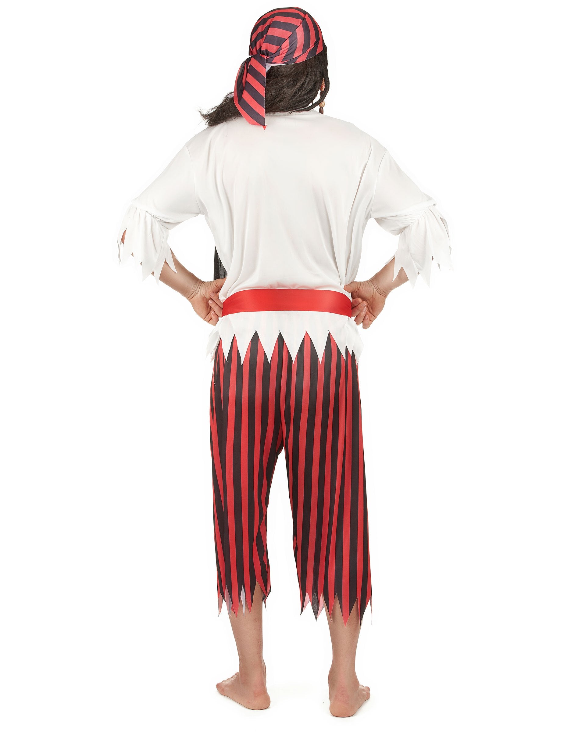 Ovaj gusar prerušen za muškarce uključuje košulju s prslukom, hlačama, pojasom i bandanom. Ovratnik bijele košulje prilagođava se crnim nizom. Crni prsluk bez rukava šiven je na njemu. Krajevi vrha, 3/4 rukava i hlača poslužuju se za naglašavanje gusarske strane. Hlače su sve u teletu s okomitim prugama crnim i crvenim. Crveni pojas treba vezati u struku. Bandana s hlačama dovršava odjeću. Ovaj gusarski gusarski kostim savršen je za pojavljivanje kao najveći morski bend na dan vaše prikrivene večeri ili za karneval.