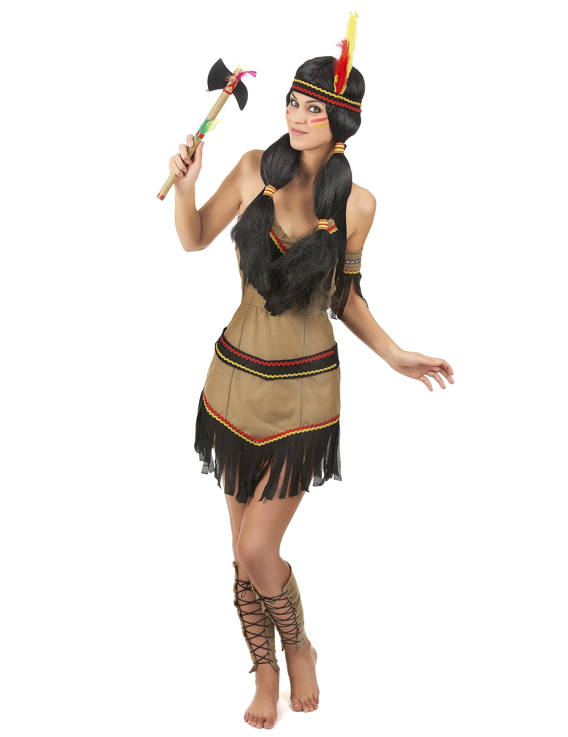 Ovaj indijski kostim za žene sastoji se od haljine sa golim leđima koja se pričvršćuje oko vrata, trake za glavu, gamaša i narukvice za ruku. Haljina je izrađena od smeđe tkanine kako bi oponašala tipične odjeće životinjskih kože. Ova će se elastična haljina savršeno prilagoditi vašoj morfologiji i ukrašena je obojenim obrubom i rubovima za 100% indijski stil. Nastava je također elastična, ukrašena je s 2 crvena i žuta pera. Hageri su podesivi zahvaljujući čipkama koje prolaze kroz metalne zakovice. Okrug ručne ruke također je uključen i za još realniji stil. Ovaj indijski kostim bit će savršen za utjelovljenje pravog Indijanaca za karneval ili za vrijeme vaših večeri prerušen u temu zapadnjaka i Dalekih zapadnih.