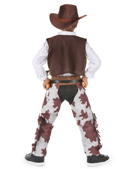Ovaj kaubojski kostim za dječaka sastoji se od imitacijskog prsluka od antilop s malim zlatnim značkama i rubovima. Ovaj kostim uključuje i pregled doista krava, crveni šal i podudarni šešir. Ovaj će set biti savršen za učinak vašeg djeteta pravim kaubojem povodom karnevala ili za bilo koji drugi prikriveni događaj. Imajte na umu šešir velike veličine.