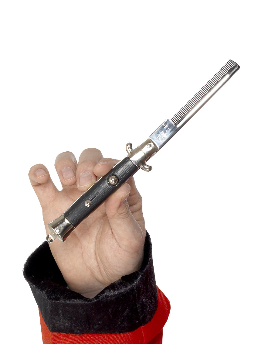 Ovaj češalj iz 1950 -ih za odrasle otvara se jednim gumbom. Zarez će vam omogućiti da ga zaključate. Ovaj potpuno retro dodatak savršen je za dovršavanje kostima mafiosa ili službene prerušavanje muškaraca.