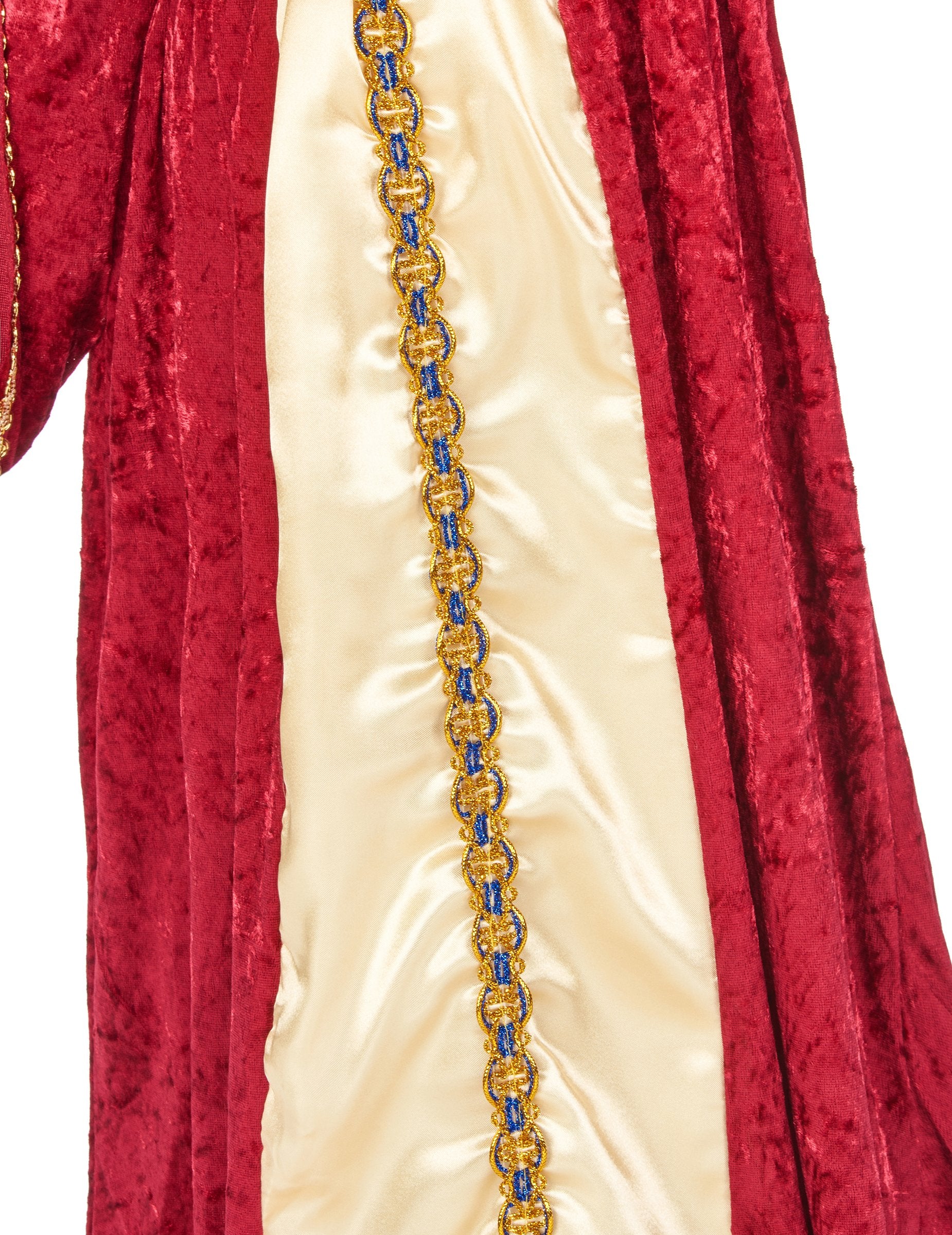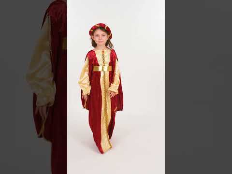 Ova srednjovjekovna kostim kraljice za djevojku sastoji se od prekrasne haljine, kape i zlatnog pojasa. Duga haljina glamuroznog crvenog i zlatnog imitacijskog baršuna obrubljena je zlatnim rubovima i lažnim vezom, zlatni rukavi su u imitaciji satena. Crvena i zlatna kapa podudaraju se (cipele nisu uključene). Ovaj veličanstveni kostim idealan je za srednjovjekovne večeri, za rođendansku užinu, predstavu ili za karneval.
