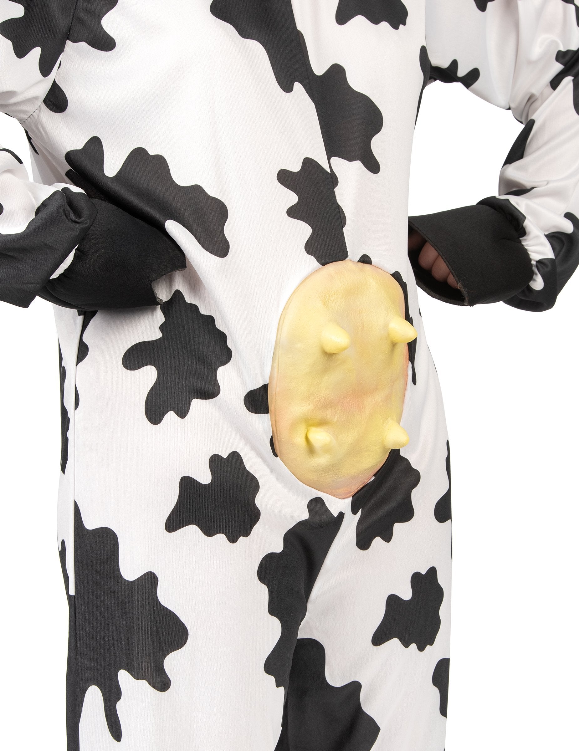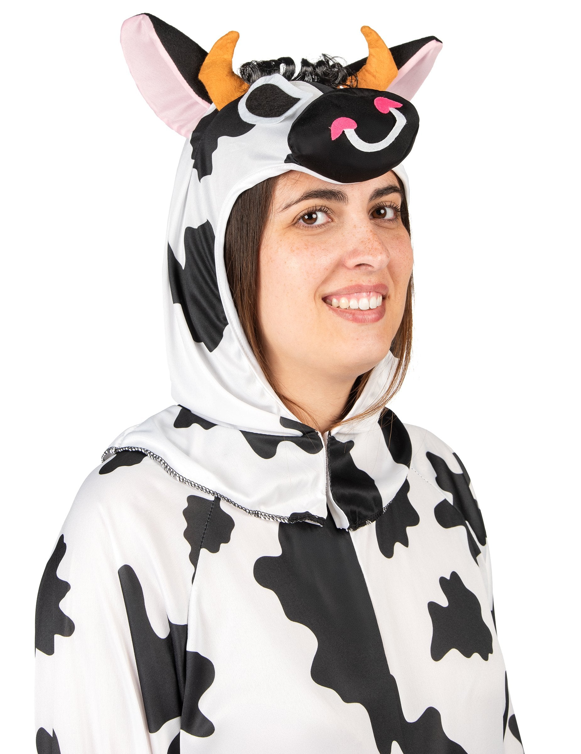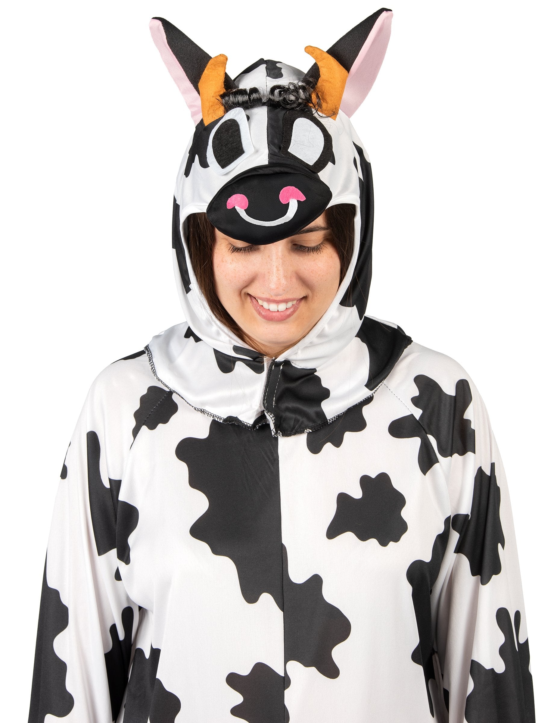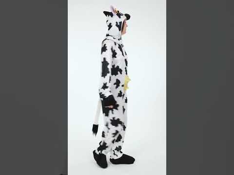 Ova šaljiva krava prerušena za odrasle sastoji se od kombinacije i kapuljače. Crna kombinacija s bijelim mrljama vrlo je fluidna i ugodna za nošenje. Od lažnih crnih kopita do krajeva ruku i stopala šiva se za više realizma. Rep je bijeli s gomilom sintetičke kose. Lažni udjeli su ušiveni u središtu, u smislu trbuha. Rogovi, uši, oči i njuška krava ušiju se na haubu. Ova vrlo šaljiva prerušavanje bit će idealna za zabavu za prvostupnike, za predstavu ili za prikrivenu večer.