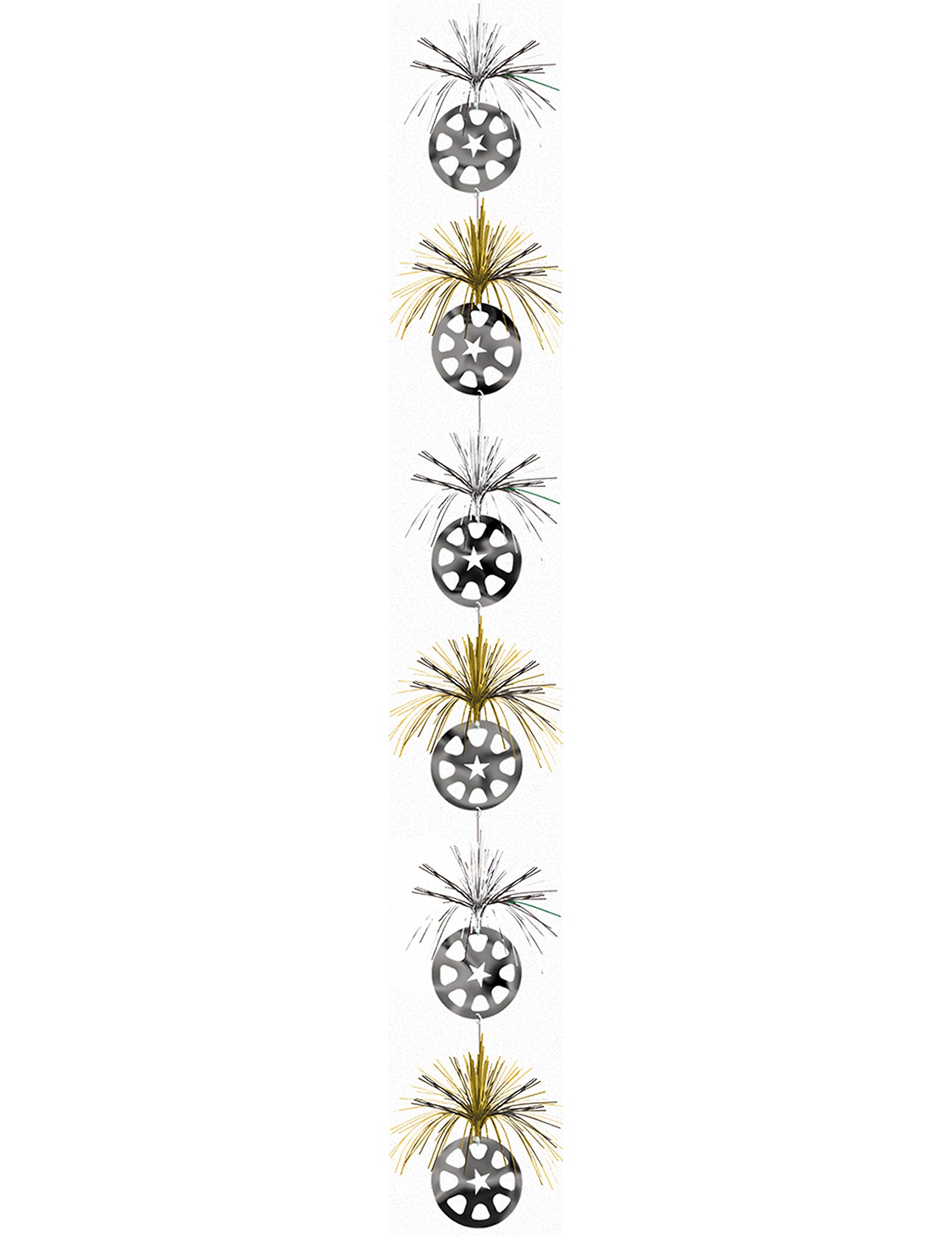Ovaj viseći ukras je zlatne i srebrne boje. Mjeri otprilike 2m i predstavljao je kino zavojnice nadmoćne zlatnim i srebrnim metalnim slapovima. Ovaj dodatak bit će idealan za ukrašavanje i stvaranje zabave atmosfere tijekom večeri na temu kina ili bilo kojeg drugog svečanog događaja.