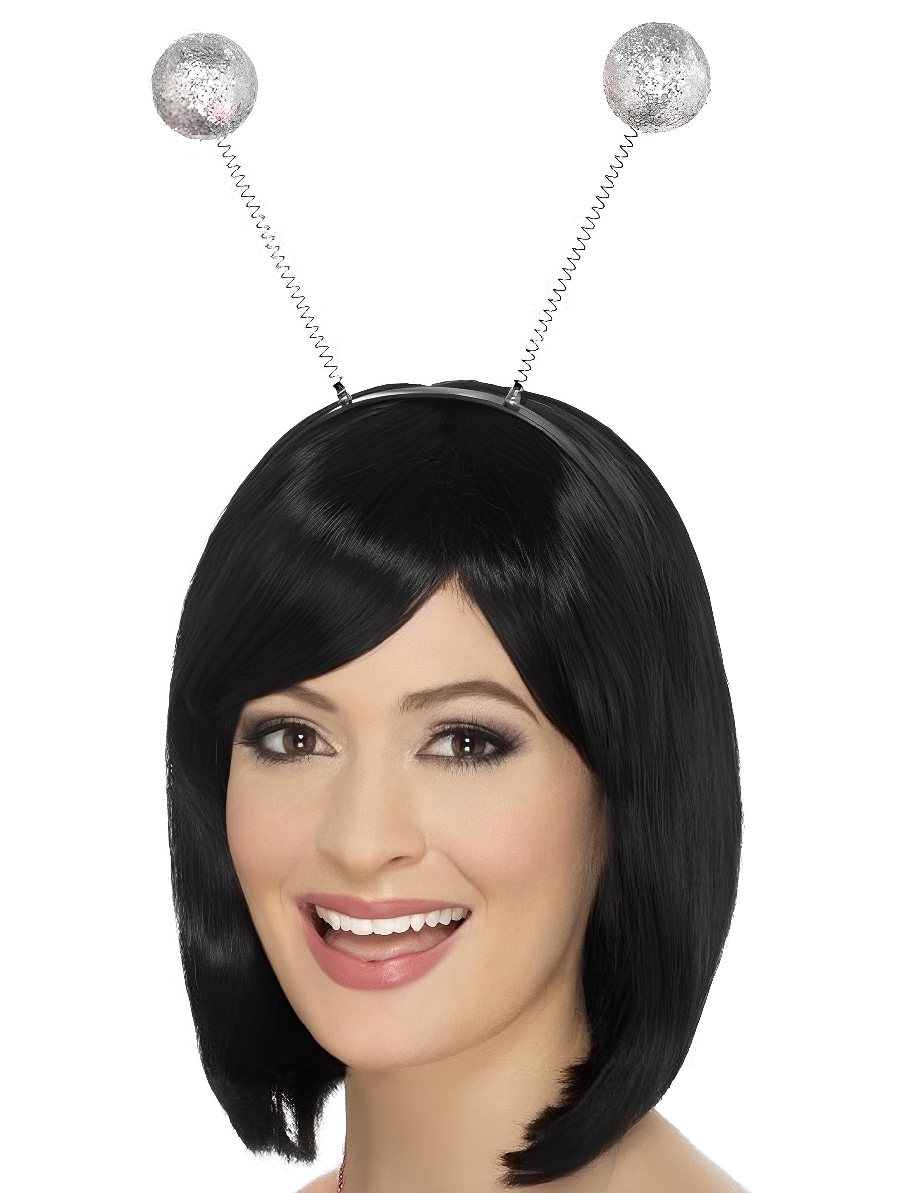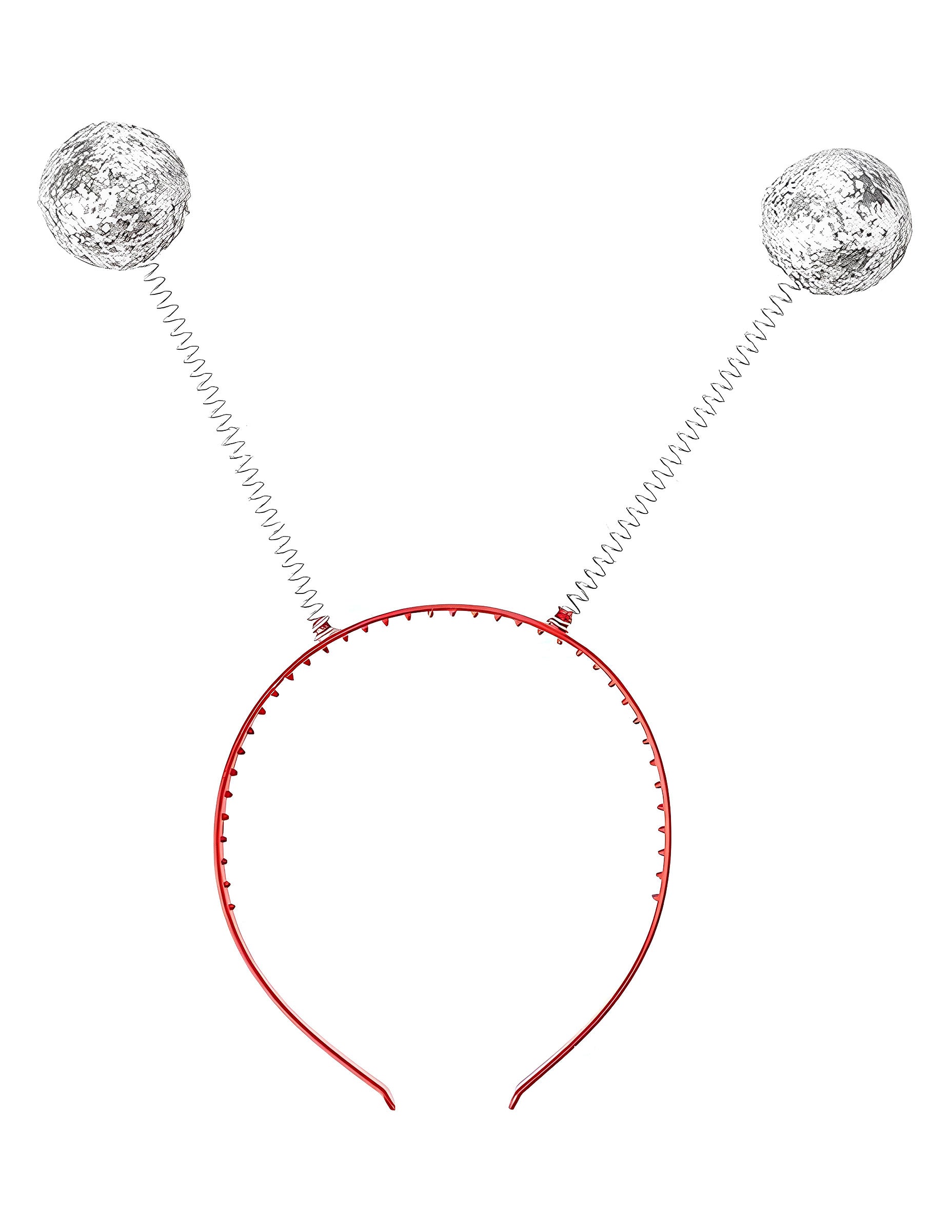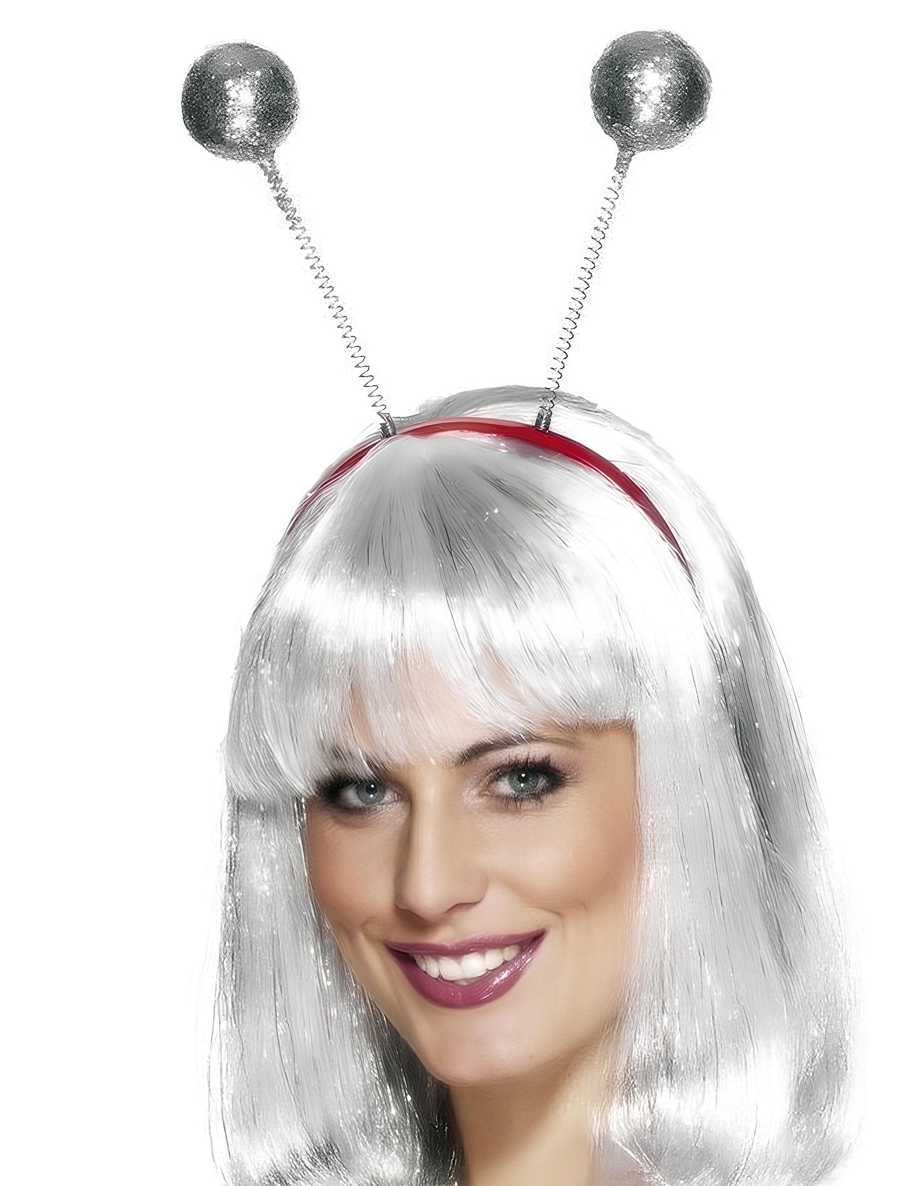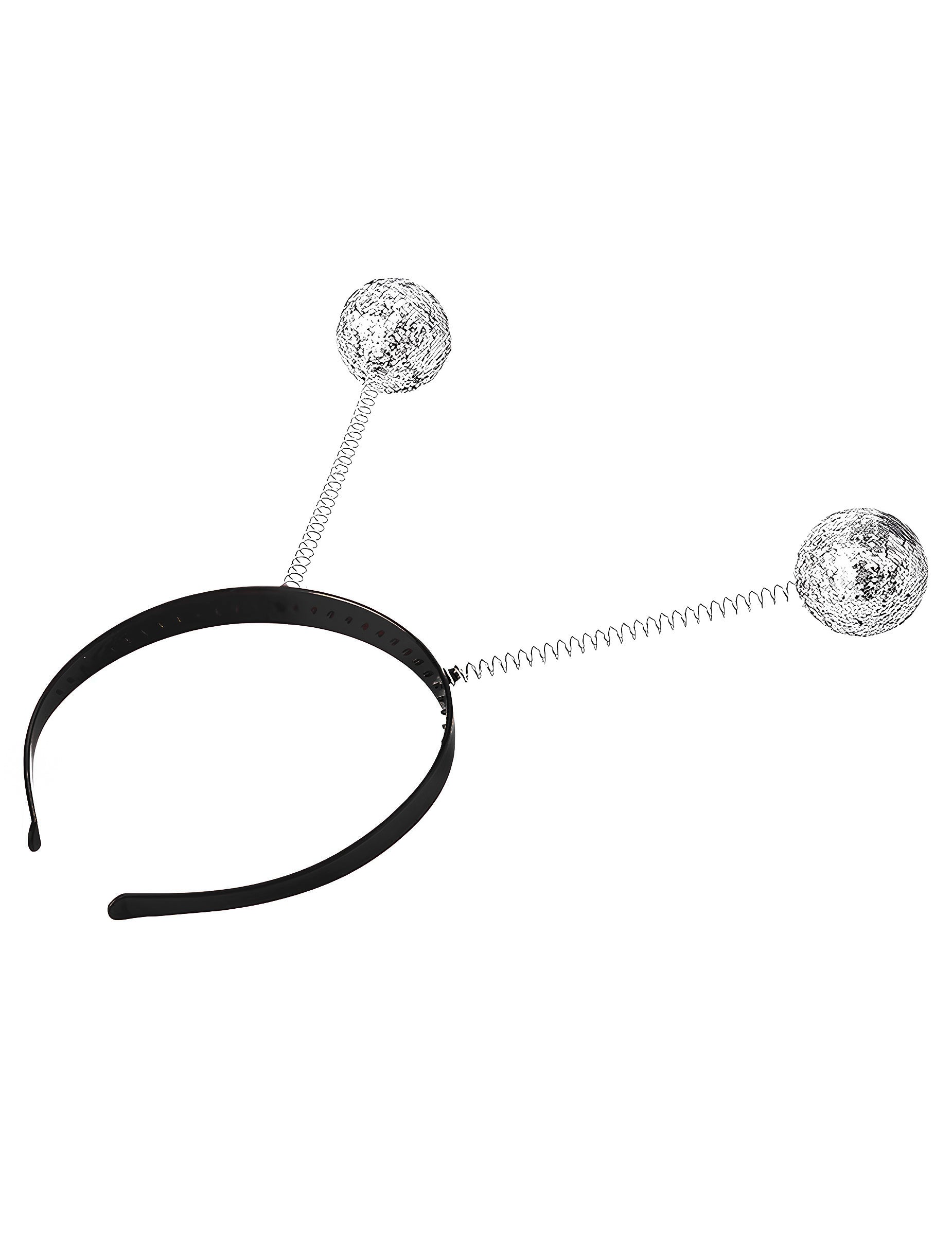 Plastična traka za glavu s dvije metalne opruge koje završavaju u srebrnim kuglicama prekrivenim sjajem. Sa svakim pokretom kuglice iskriče i kreću se za zabavan efekt. Poslana boja je slučajna: traka za glavu može biti crna ili crvena. Idealno za dovršavanje kostima ili dodavanje svečanog dodira večeri.