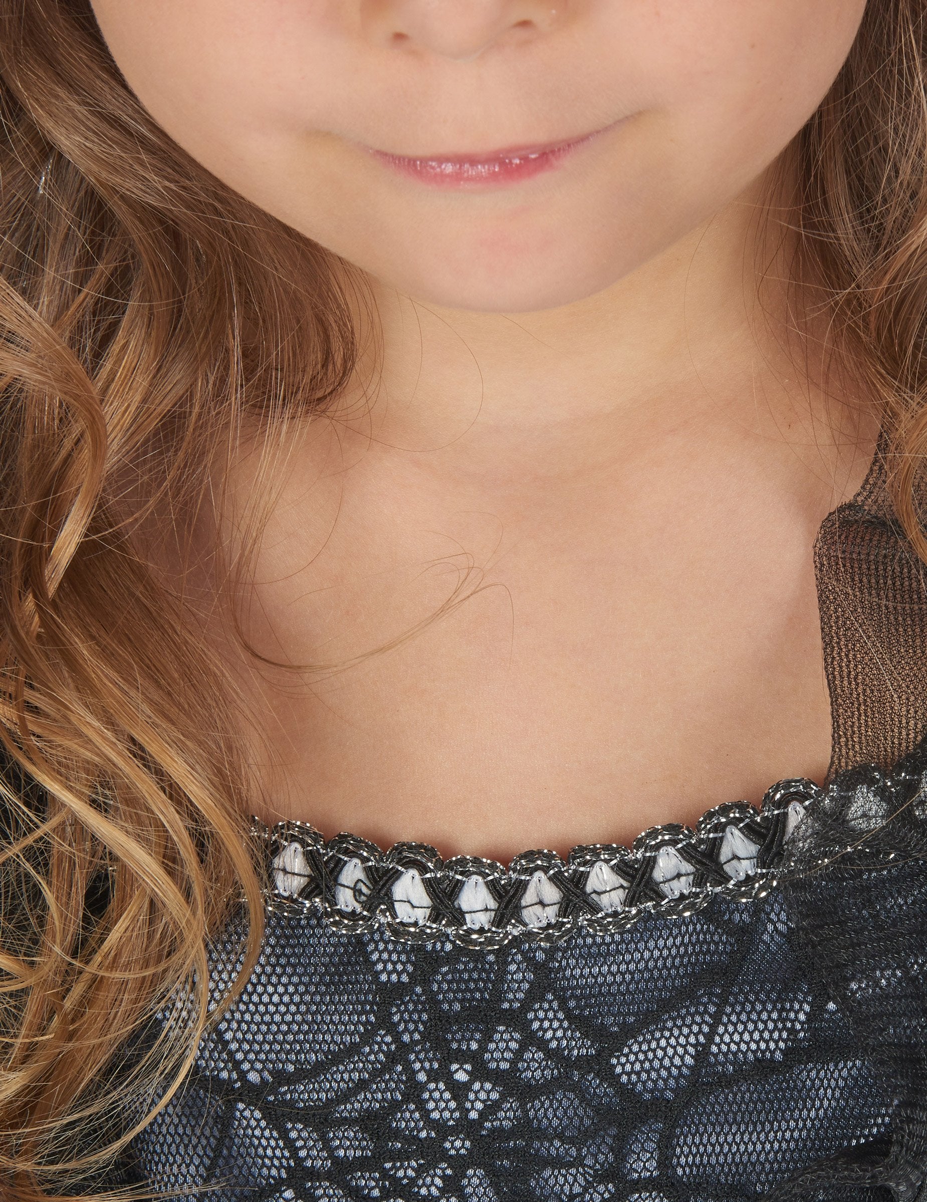 Ovaj comtesse vampir za djevojčicu prerušen sastoji se od crne haljine, pettika i tiare. Haljina je duga, meka i svilenkasta i dugačka 101 cm. Crna je i satenska ponoćna plava. Rukavi su čipka, a jedra šiva se na haljini. Kućica je elastična u struku i ima obruč koji daje volumen haljini. Vaše će dijete biti najljepše sa svojim vampirskim kostimom za Noć vještica.