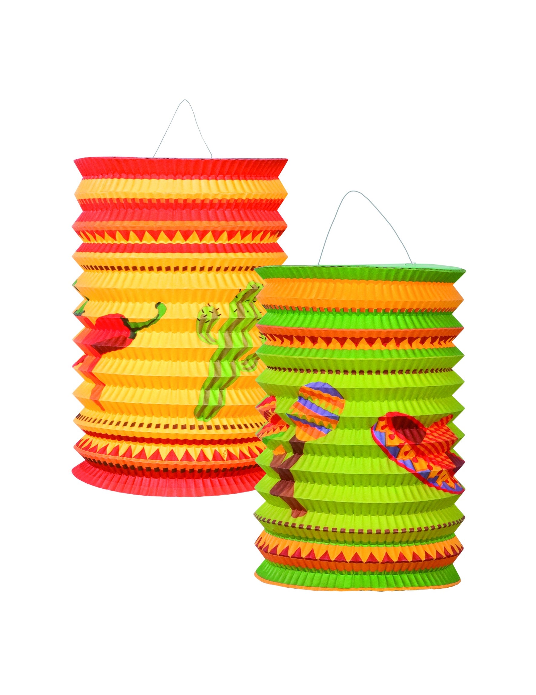 Dvije meksičke ispisane kartone lampione od kojih svaka mjeri promjera 16 cm. Metalna žica pričvršćena na vrhu omogućit će lako visi. Ovaj je set idealan za uređenje vaše unutrašnjosti ili vani tijekom svečanog događaja na gusarskoj temi.