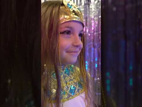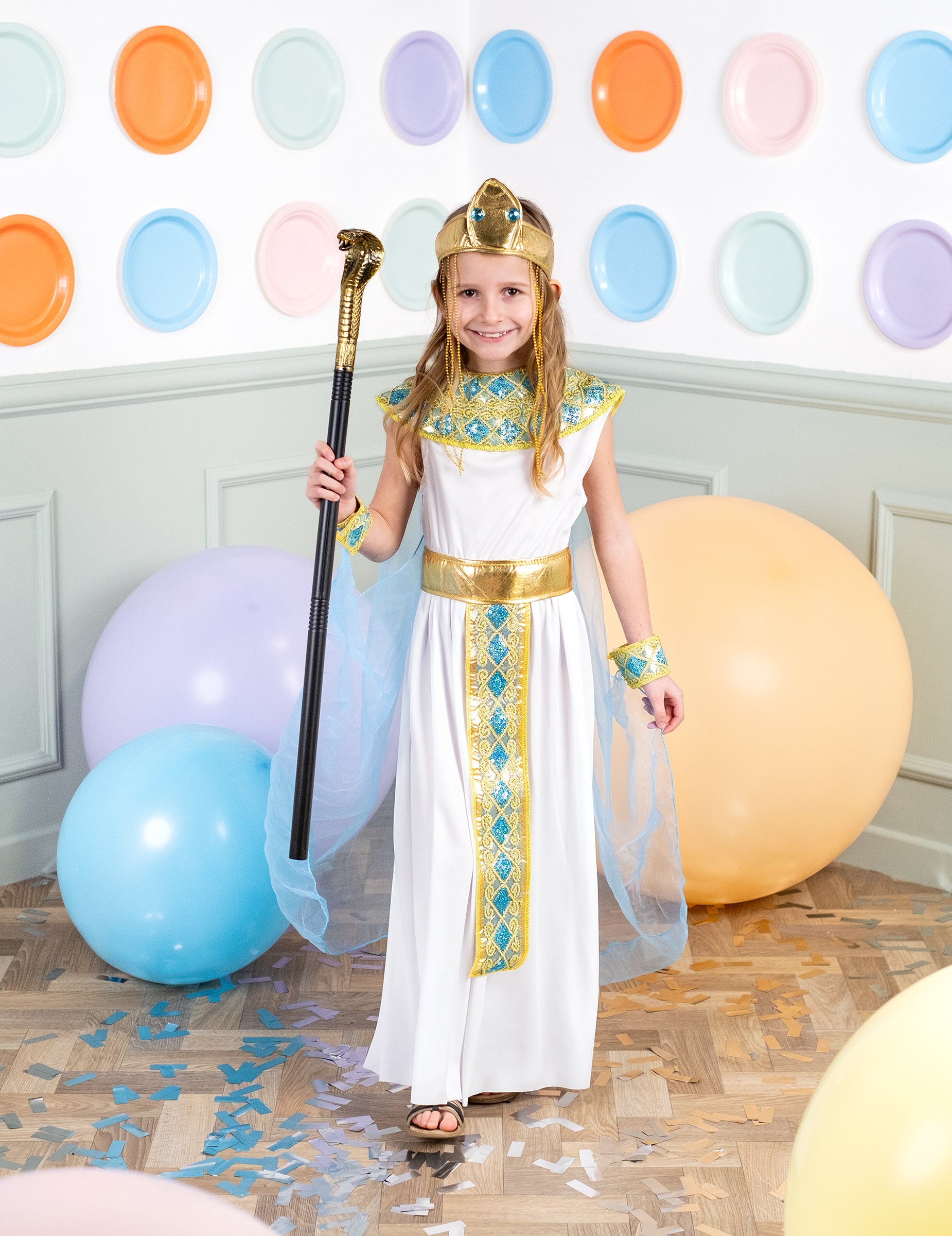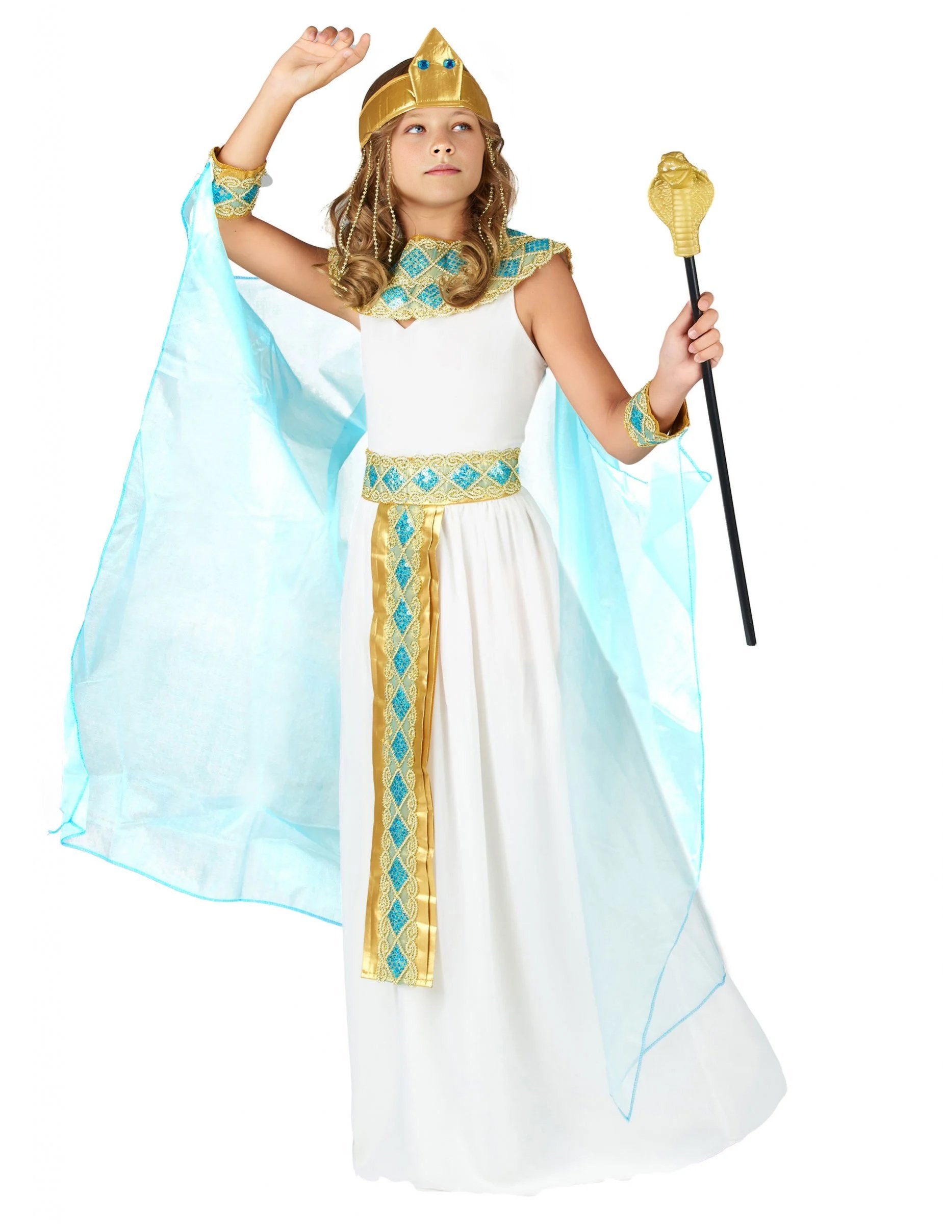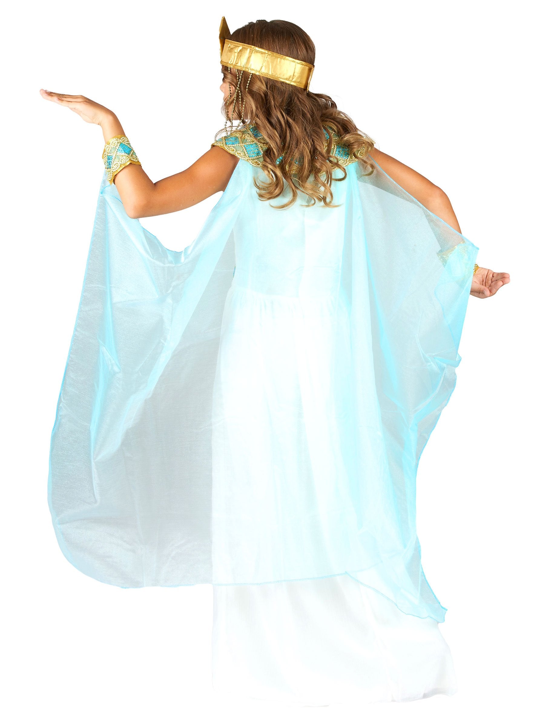 Ovaj vrhunski egipatska kraljica kostim za djevojku sastoji se od haljine, ogrtača, ovratnika, kape i dvije narukvice. Haljina bez rukava je bijela. Ima vrlo lijep remen ukrašen prugama i šljokicama u zlatnim i plavim tonovima. To se lako može obustaviti zahvaljujući otvoru straga koji se zatvara pomoću ogrebotina. Prolaz i dvije narukvice izrađuju se na isti način kao i remen za haljinu, a također su u blizini ogrebotina. Pruža se plavi čisti ogrtač i pričvršćuje se na ramena haljine i na narukvica sustavom ogrebotina. Konačno, zlatna poklopac ukrašena lažnim biserima dovršava cjelinu. Može se podesiti i zatvoriti pomoću ogrebotine. Ovaj će kostim biti savršen za utjelovljenje sjajne kraljice Egipta tijekom karnevala ili za bilo koji drugi svečani događaj!
