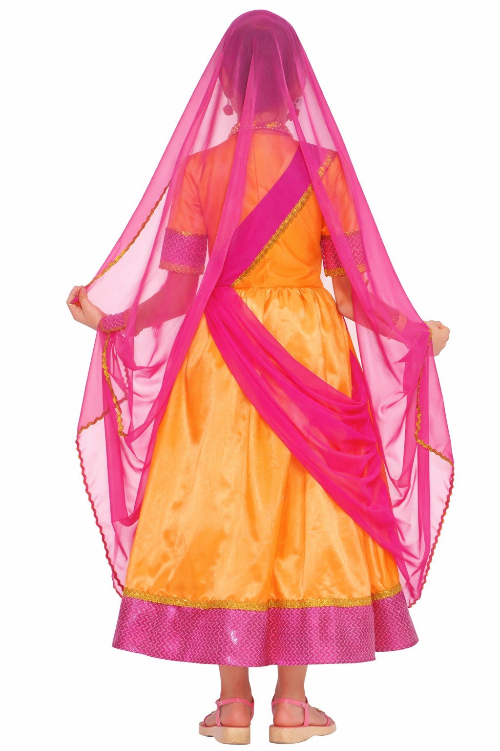 Ovaj kostim princeze u Bollywoodu za djevojku sastoji se od haljine kratkih rukava, vela i manžeta. Sjajna ružičasta tkanina prisutna je na cijeloj odjeći, kao i upravljač na dnu haljine. Veo i manžete su ružičasti i ukrašeni zlatnom obrubom. Možete ogrebati manžetno veo koji će tako pratiti sve pokrete koje će vaše dijete učiniti. Ovaj je kostim idealan za karneval ili vaše prikrivene događaje.