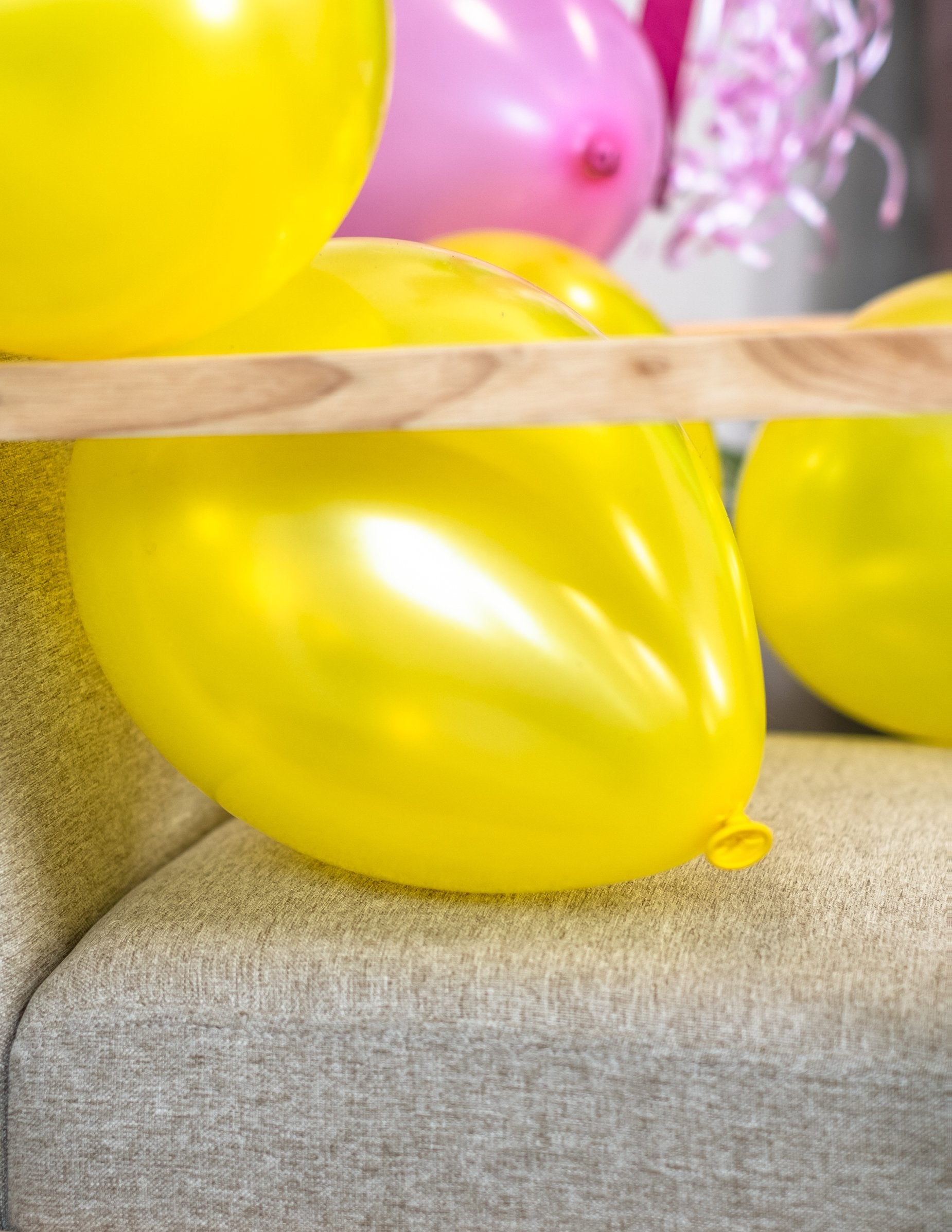 12 metalnih žutih balona promjera 28 cm. Ti su baloni izrađeni od prirodne gume i potpuno biorazgradivi.