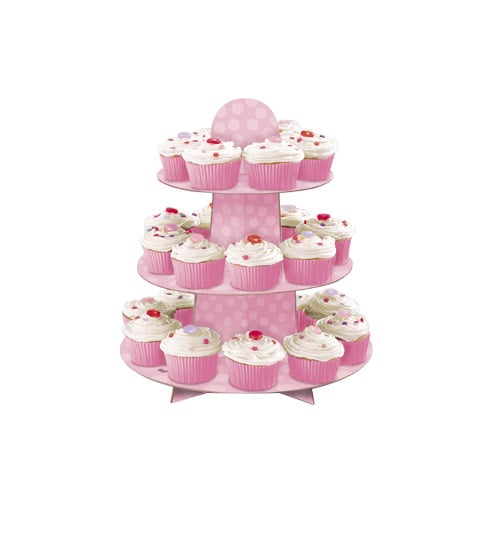 Ružičasta ružičasta podrška za cupcake, idealna je tijekom popodneva s djevojkama ili tijekom rođendanskih grickalica. Ovaj kartonski potpornik mjeri 34 cm u visini i promjera 30 cm. Na 3 kata može sadržavati 24 kolača. Jedinstvena brendijska zabava