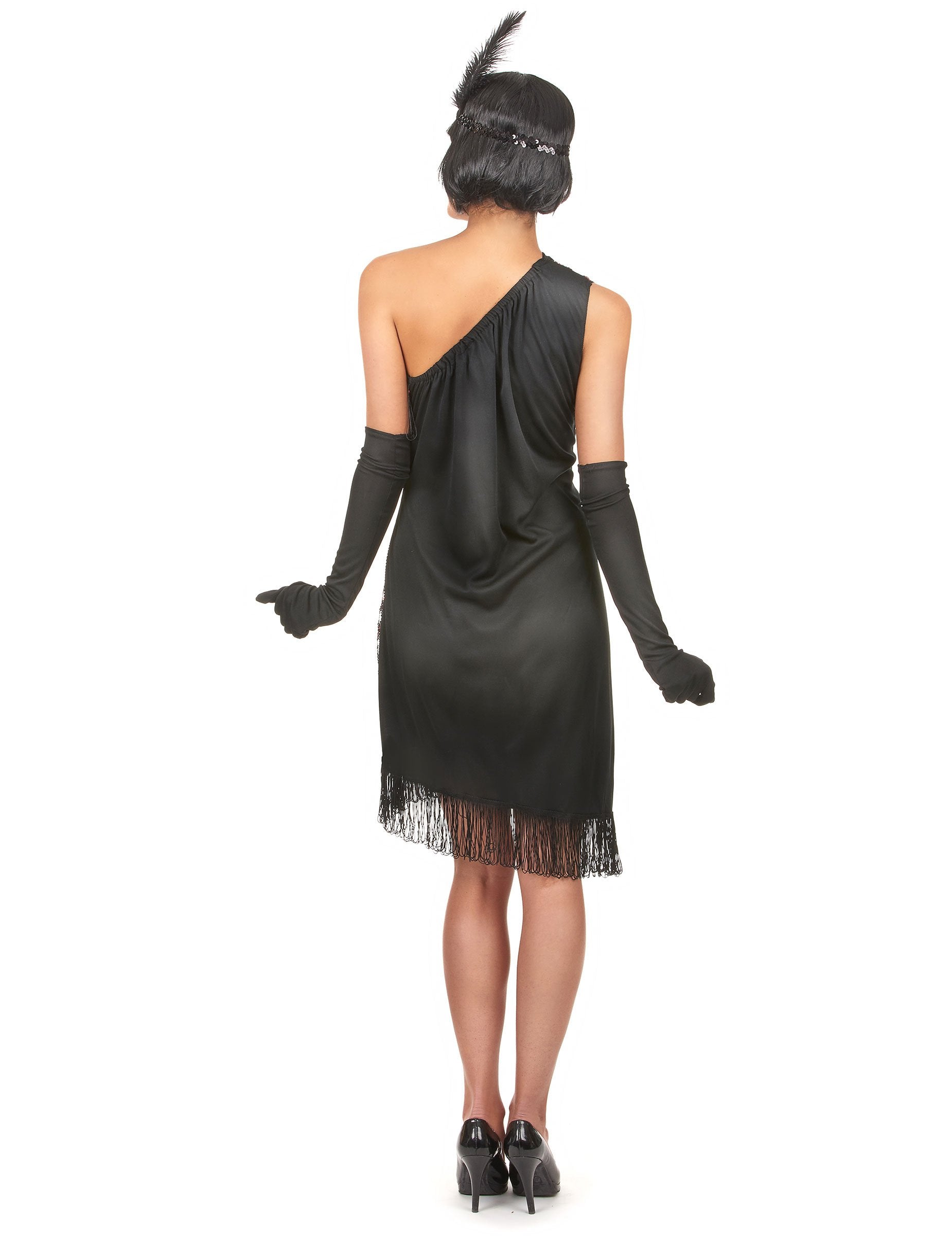 Ovaj kostim u Charlestonu za žene sastoji se od haljine, trake za glavu i dugih rukavica (cipele nisu uključene). Asimetrična haljina ima crni i crveni sjaj na prednjoj strani, kao i rubove na vrhu i na dnu odjeće. Ovu haljinu iz dvadesetih godina dovršava: Charleston Strip s crnim sjajem s perjem i par dugih rukavica. Ovaj će set biti savršen za igranje Josephine Baker tijekom kostimske večeri ili na temu 20 -ih.