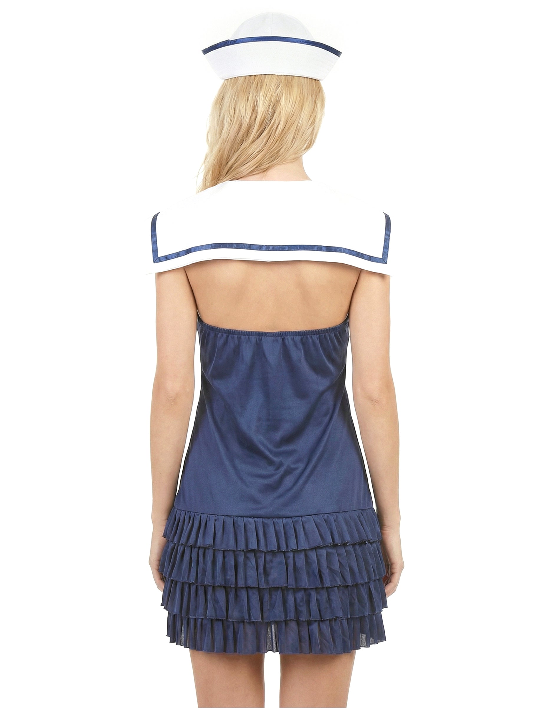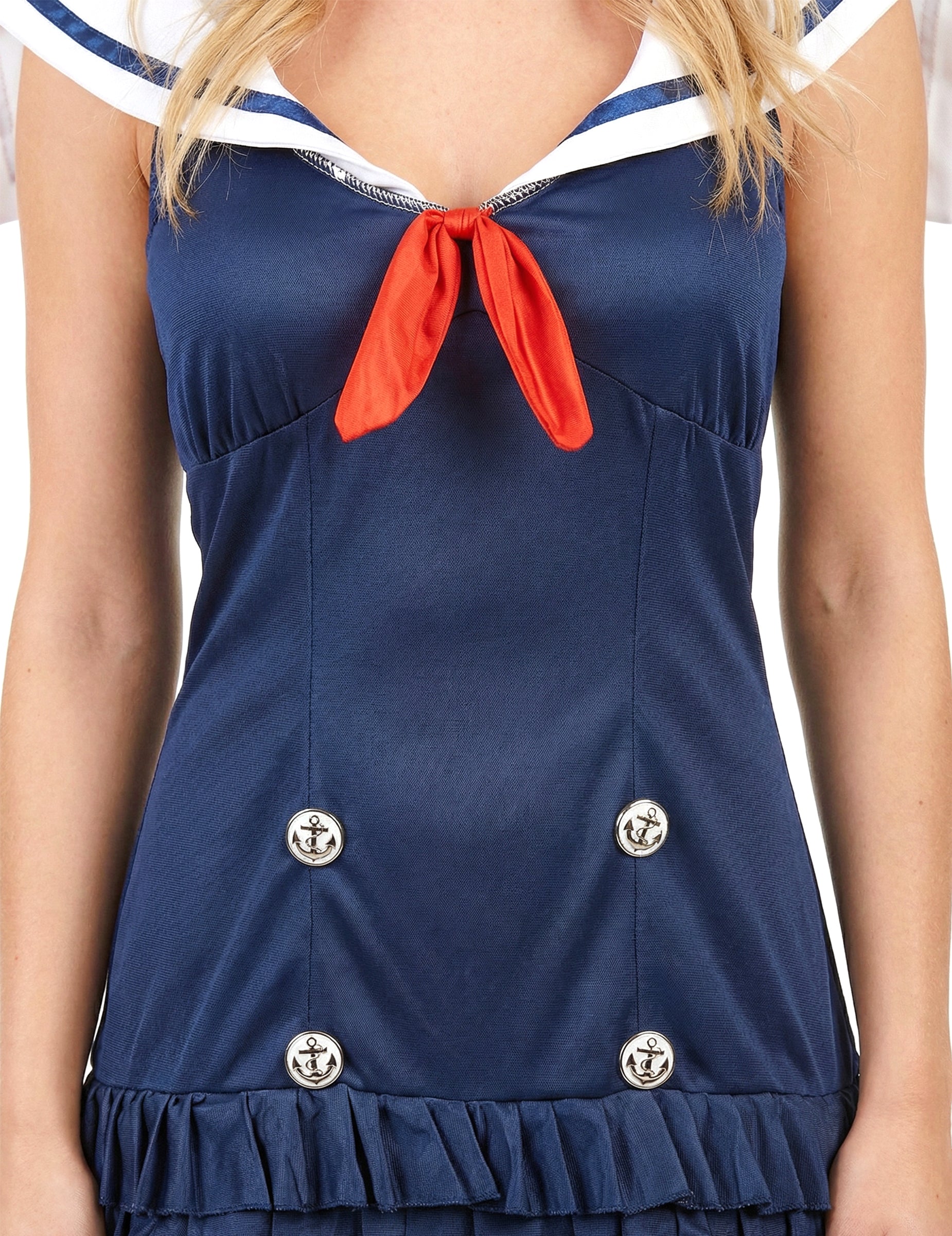 Ovaj morski kostim za žene sastoji se od haljine i kape. (Cipele i blizanci nisu uključeni). Mornarsko plava haljina ima crveni čvor na prednjoj strani, kao i ovratnik koji pokriva ramena i gornji dio leđa. Srebrni gumbi s morskim tiskom dolaze ukrasiti prednji dio odjeće. Mornarička i bijela kapica u boji pristupit će haljini. To će odgovarati većini trikova glave. Ovaj će set biti savršen za karneval ili bilo koji drugi kostim.