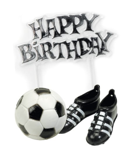 U setu ćete pronaći topper za tortu s natpisom "Happy Birthday" veličine oko 6,5 cm, nogometnu loptu promjera oko 2,5 cm i par kopački veličine oko 4 cm.