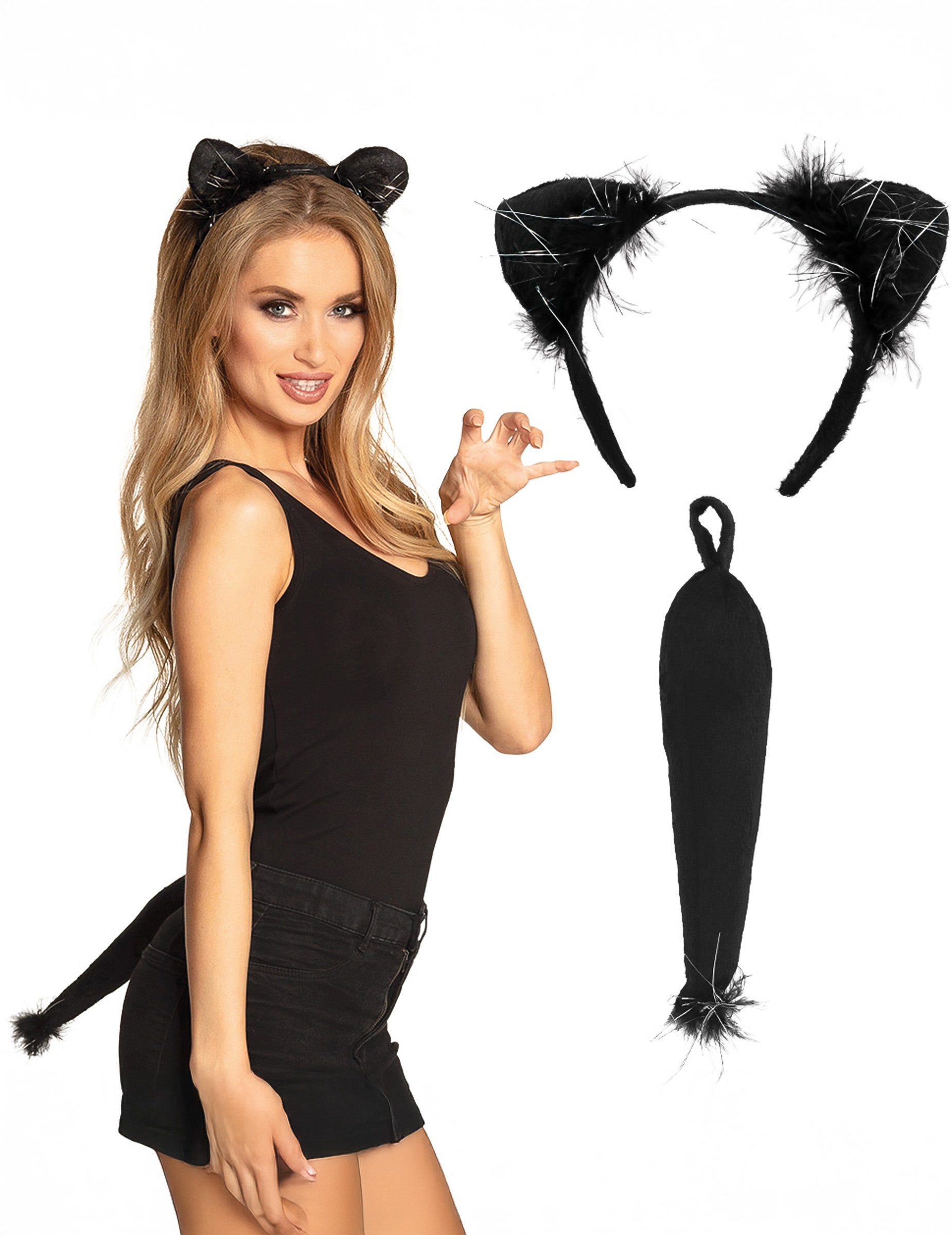 Ovaj set za odrasle mačke sastoji se od trake za glavu i repa. Traka za glavu ima crne šiljaste uši. Rep je izrađen od pjene i može se držati na vašem pojasu zahvaljujući maloj petlji na svom kraju. Mali srebrni filamenti i malo crno perje također su prisutni na ušima i na kraju repa kako bi se u cjelini donio dodir fantazije i sjaja. Ovaj je set idealan dodatak za dovršavanje kostima za mačke tijekom karnevala ili bilo kojeg drugog svečanog događaja.