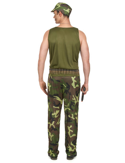 Ovaj vojni kostim za muškarce sastoji se od visokih, hlača i kapice (ovratnik, oružje i pojas nisu uključeni). Vrh je kaki zeleni tenk. Hlače, u zelenim tonovima, imaju kamuflažni otisak. Konačno, kapica s hlačama dovršava ovaj kostim. Ovaj vojni kostim bit će savršen za utjelovljenje odvažnog vojnika povodom karnevala.