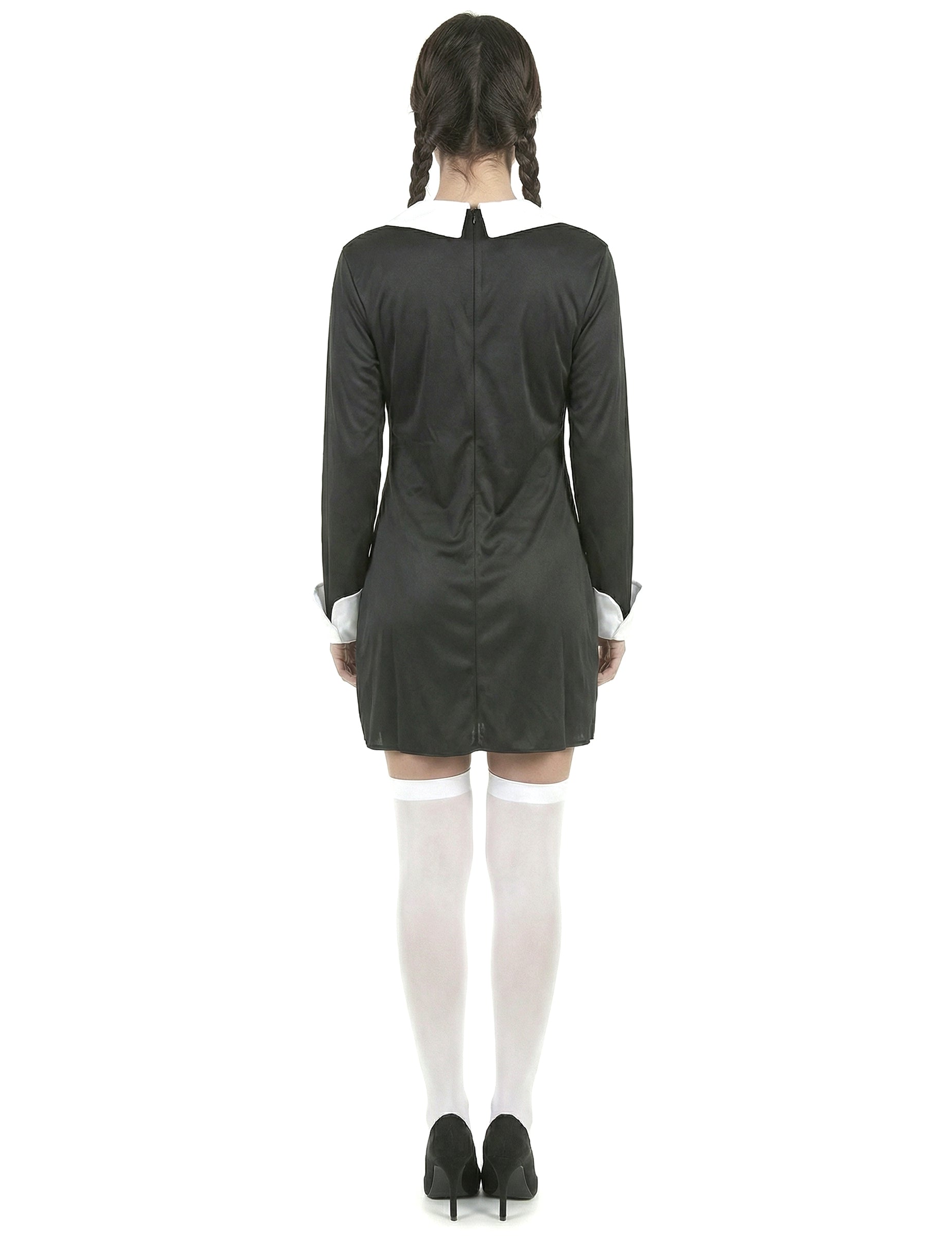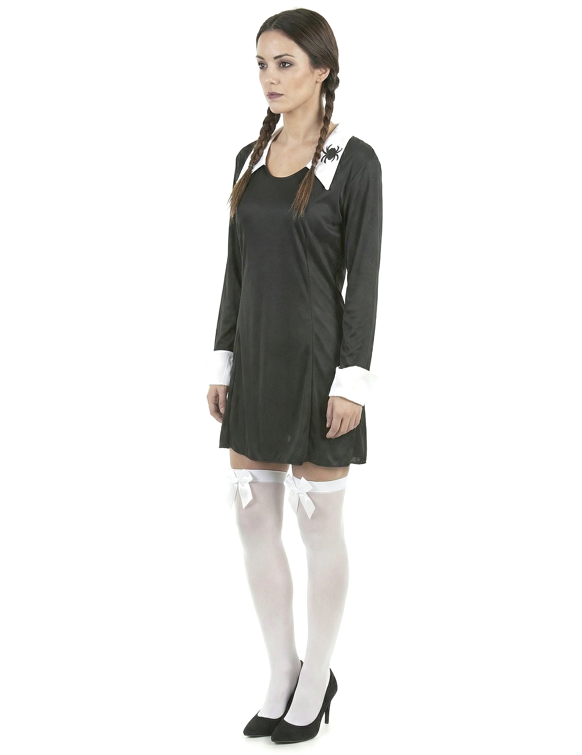 Ovaj kostim za žene za žene sastoji se od haljine (nisko i cipele nisu uključene). Kratka haljina je crna, s ovratnikom i bijelim zglobovima. Na prolazu je zastupljen crni pauk. Ovaj će kostim biti savršen za utjelovljenje školarke na tami na Noć vještica ili za večer na temu užasa.