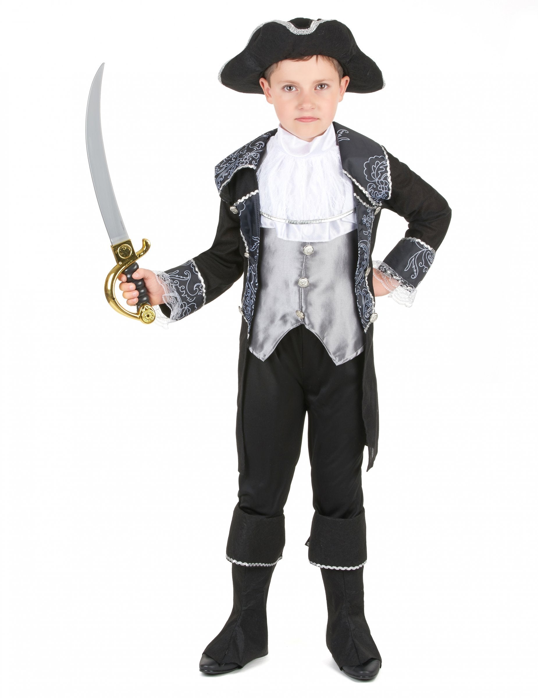 Ovaj kostim pirata za dječake sastoji se od kaputa, prsluka, šešira i navlaka za čizme (sabja i hlače nisu uključene). Dugi kaput je crne boje. Ovratnik i rubovi rukava ukrašeni su sivim arabeskama i srebrnim trakama. Bijela čipka također krasi donji dio rukava.