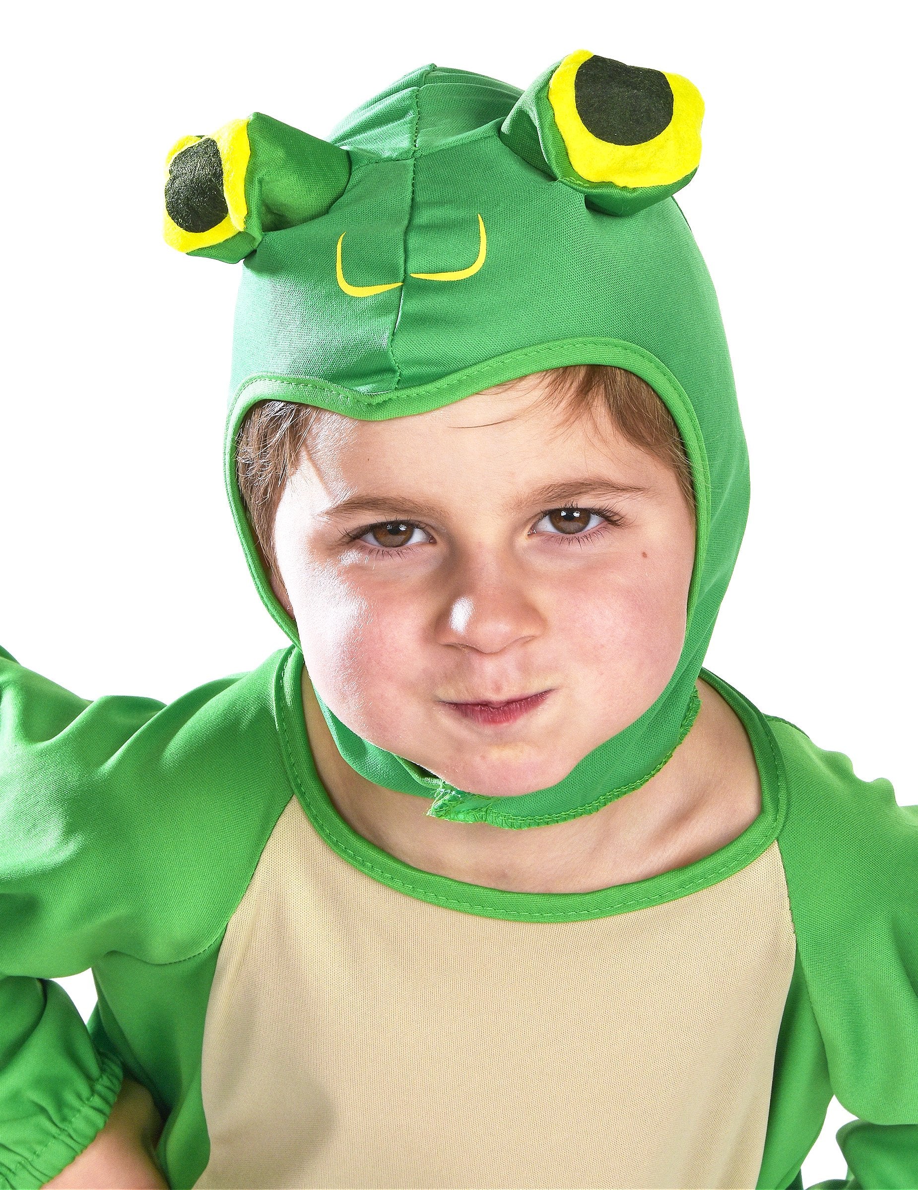 Ovaj kostim za žabu sastoji se od kombinacije i kapice. Kombinacija je zelena s bež trbuhom. Zelene noge su također predstavljene i djelovat će kao prekomjerno. Na taj će način stopala biti dijelom skrivena. Kombinacija se lako stavlja pomoću ogrebotine na vrhu leđa. Oglas za glavu predstavlja glavu žabe. Zelene boje, ima velike žute globularne oči. Pričvršćen je ogrebotinama ispod brade. Ovaj će kostim biti savršen za promjenu u maloj žabi za karneval ili povodom emisije.