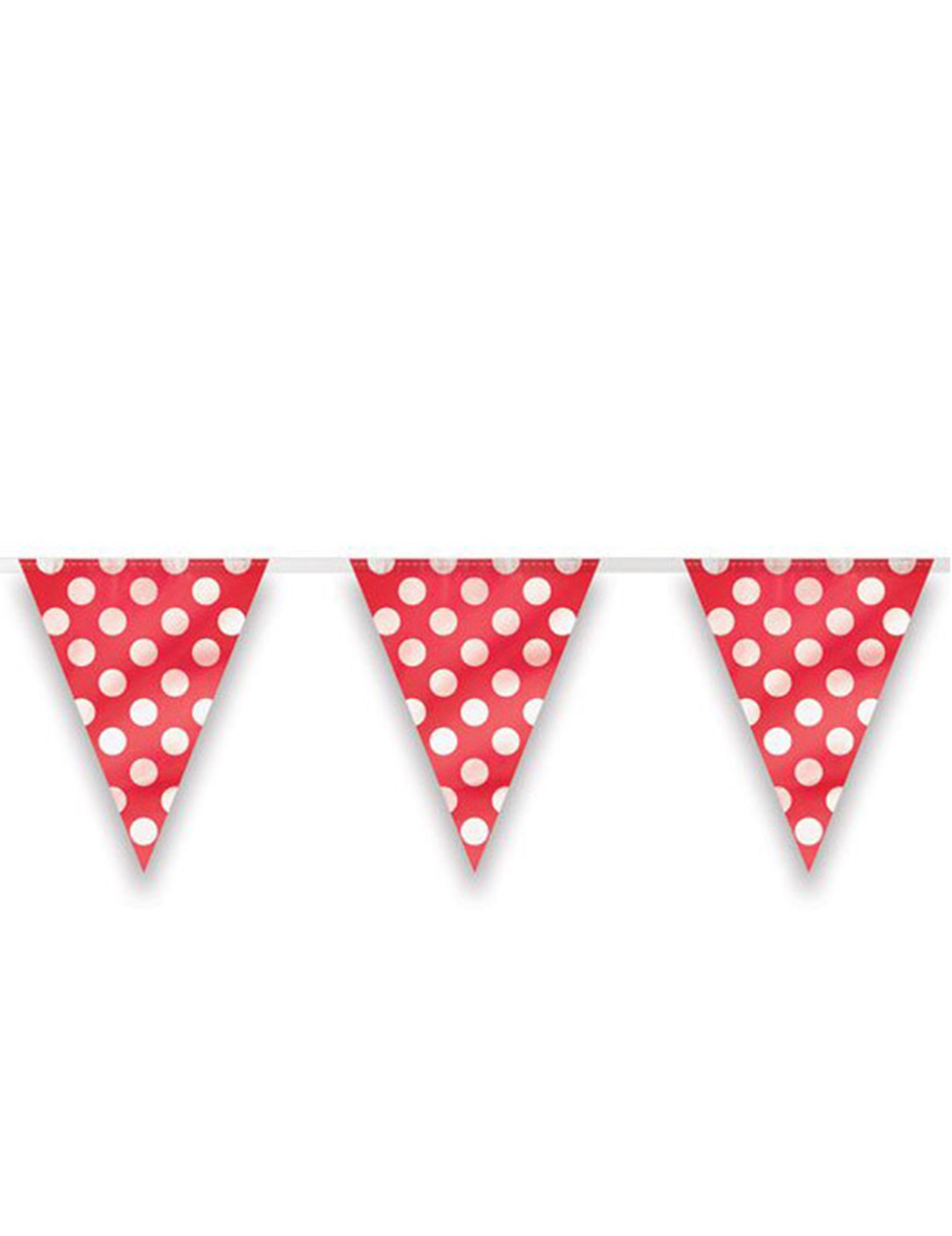 Dodajte svečani ugođaj s ovom plastičnom girlandom ukupne dužine 3,65 metara. Sastoji se od nekoliko zastavica veličine 26,5 x 22 cm, s klasičnim crvenim uzorkom s bijelim točkicama. Ovaj dekorativni dodatak idealan je za uljepšavanje rođendana ili druženja s prijateljima.