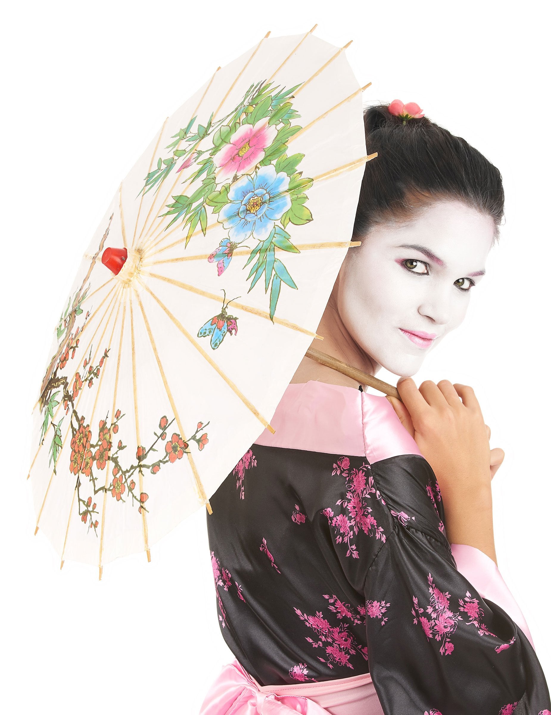 Ovaj bijeli kineski parasol izrađen je od drveta i papira. Ispisana je šarenim uzorcima koji predstavljaju cvjetove trešnje. Ovaj kišobran mjeri oko 45 cm duljine i širok 62 cm. Ovo će biti savršeno za dovršavanje gejske kostima za zabavu na temu Azije ili za proslavu kineske nove godine.